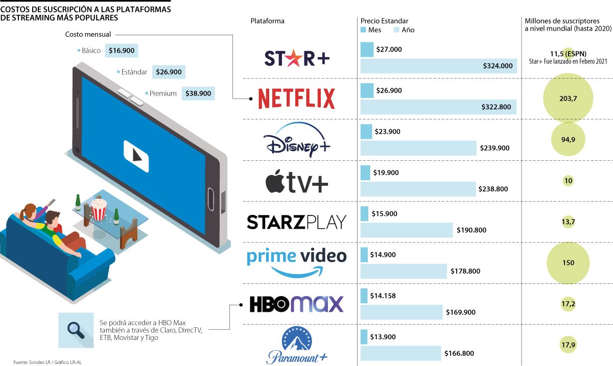 Pero con tanta oferta se ha preguntado ¿cuánto le puede costar tener acceso a todas las plataformas habilitadas en Colombia, o al menos a las más populares?. Para lograr tener una cuenta a las cinco más buscadas a nivel local se necesita una suscripción a cada una, lo que costaría más de $1,2 millones al año sumando las membresías de Netflix, Amazon Prime Video, Disney+, Star+ y HBO Max. En el caso que también se esté suscrito a Apple TV+, StarzPlay y Paramount la cifra ascendería a $1,8 millones (ver gráfico).