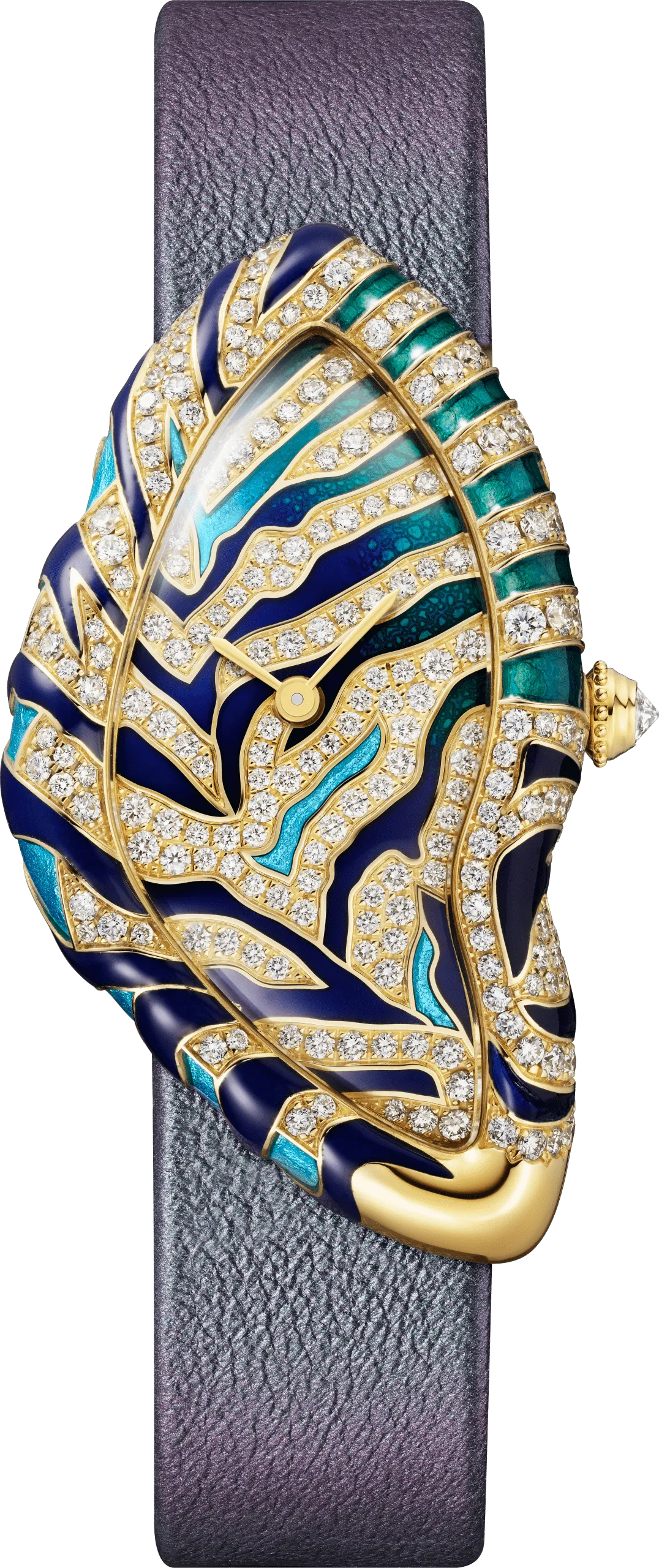 En este reloj los artesanos recurrieron a numerosas técnicas de esmaltado. El esmalte se adapta en función de las necesidades: a veces opaco, a veces translúcido o en degradado, pero también trabajado sobre una placa de plata y sobre grabado. Sobre el bisel, las rayas se elaboraron a través de esmalte excavado. Tanto para el contraste como para el brillo, las rayas se separan mediante líneas de diamantes engastados. La corona de cuerda está engastada con un diamante con pabellón invertido, firma del joyero.