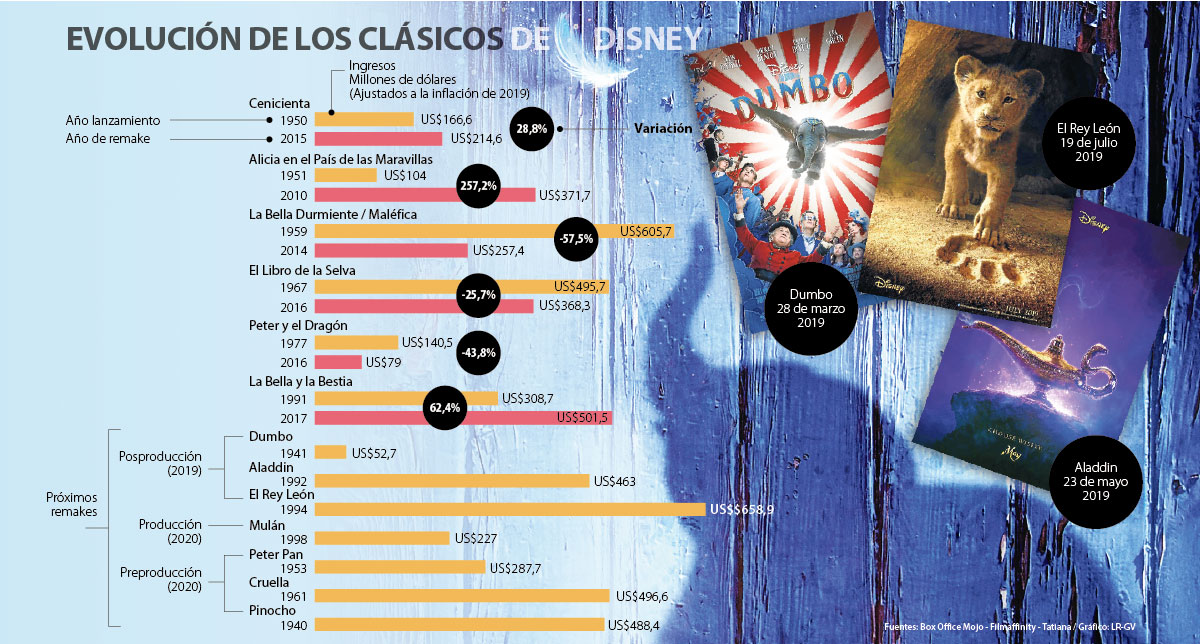 Aunque la recepción de los remakes no ha sido del todo positiva, Disney planea seguir renovando sus clásicos. El próximo 28 de marzo se estrenará Dumbo y el 23 de mayo será el turno de Aladdin. Según Armando Aguilar, gerente de distribución de Cine Cinecolor Films, representantes de Disney en el país, esperan tener 1,5 millones de espectadores. Para El Rey León, que se estrenará el 19 de julio y es definido por Aguilar como “el más esperado por la audiencia”, estiman llegar a los 4,5 millones de espectadores.
