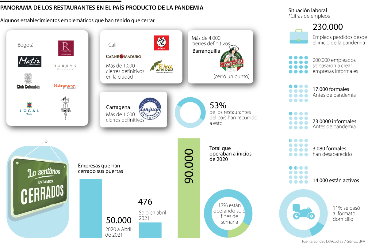La cifra alarmante que arroja el gremio de los restaurantes, Acodres, es que se estima que al cierre de abril pudieron ser 50.000 establecimientos gastronómicos cerrados definitivamente por la crisis; teniendo en cuenta que, para el pasado 15 del mismo mes, el reporte oficial era de 48.900 cierres y en las dos últimas semanas hubo 470 establecimientos que terminaron la operación.