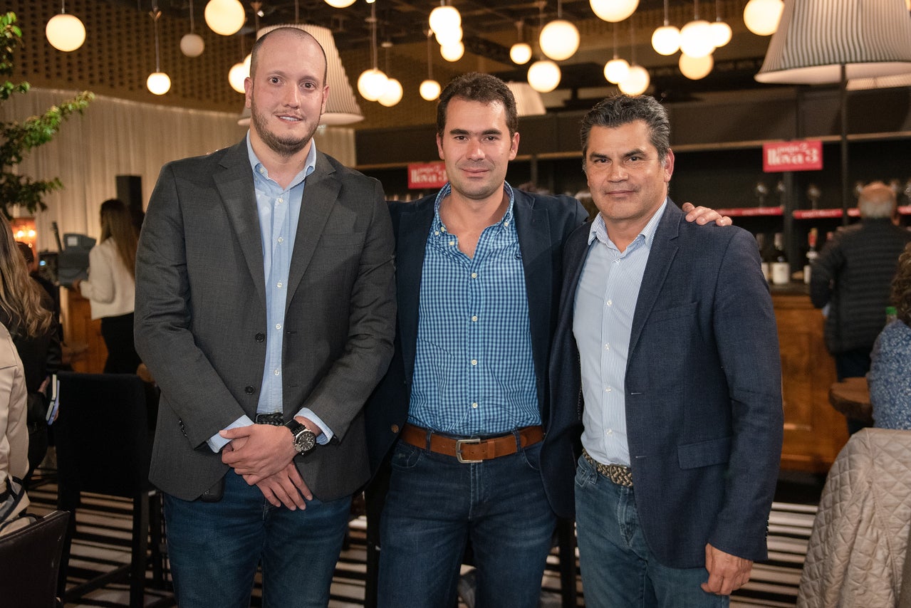 Mateo Jaramillo, exdirector de Expovinos; Andrés Escobar, invitado, y Carlos Ariel Gómez, vicepresidente comercial y de abastecimiento de Grupo Éxito, durante la feria