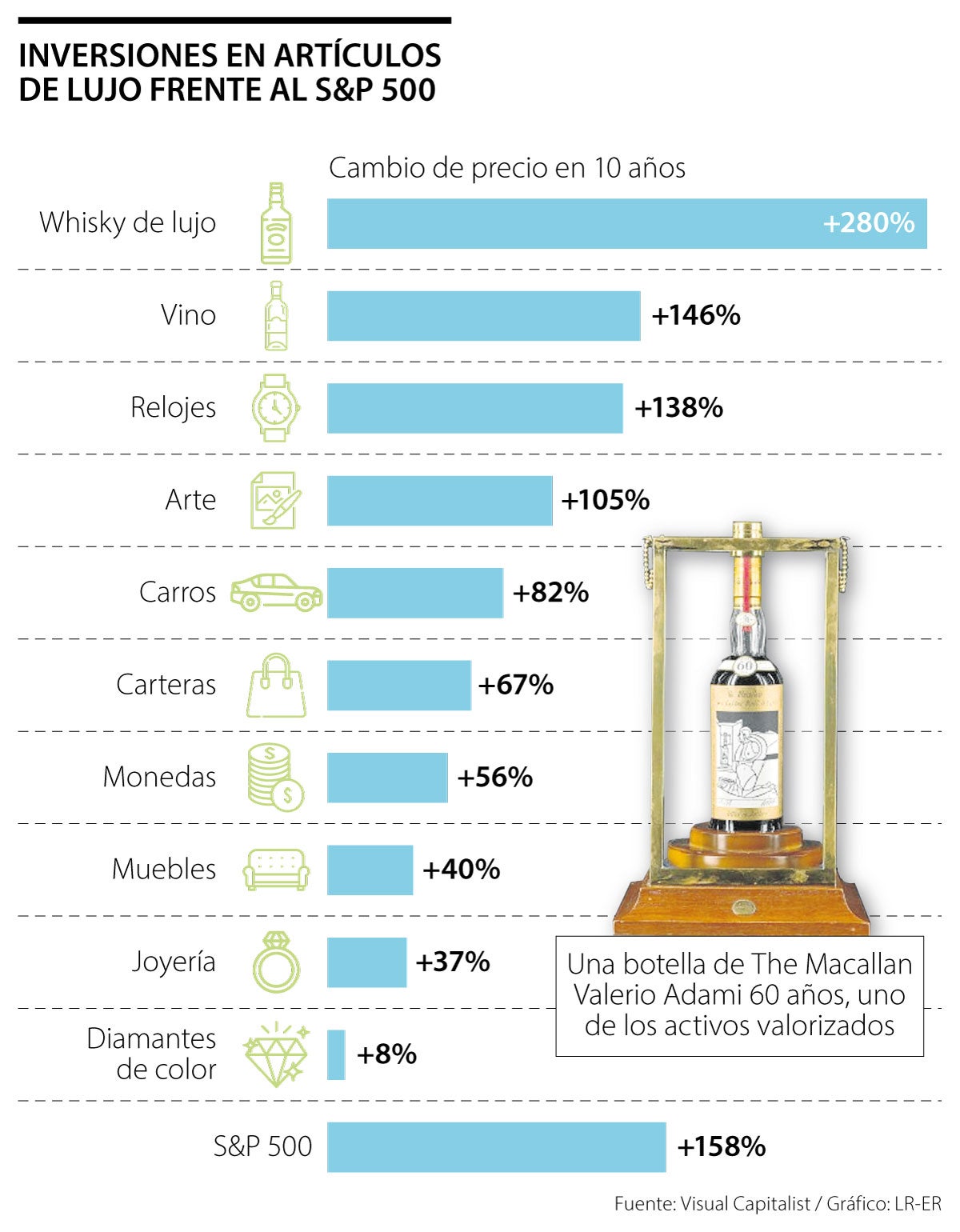 El estudio señala que los whiskies de lujo, o exóticos, han sido los de mayores rendimientos en la última década entre los artículos de valor, incluso, por encima del índice bursátil S&P 500. En sí, este licor ha logrado una revalorización de más de 200% en 10 años, mientras que las 500 empresas del S&P 500 han tenido rendimientos de 158%.