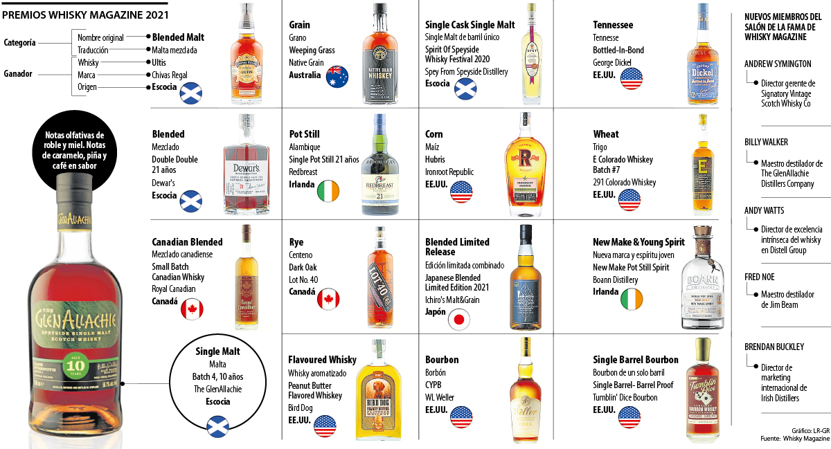 Por parte de los bartenders, embajadores de marca, maestros destiladores, minoristas, compradores y productores artesanales fueron reconocidos en los premios ‘Iconos del whisky’ de la misma revista. Y finalmente, quienes llevan toda una vida dedicada a este licor son incorporados al salón de la fama, en este caso entraron cinco “héroes del whisky” para conformar un grupo de 73.
