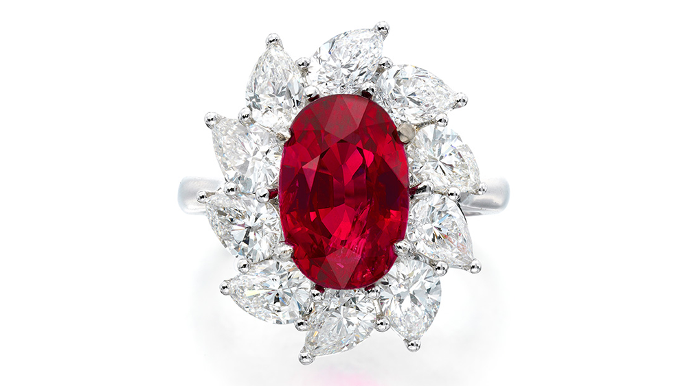En la exhibición, el lote superior es el Dragón Rojo, un rubí birmano de 6,43 quilates y un anillo de diamantes estimado en US$1 millón a US$$1,5 millones.