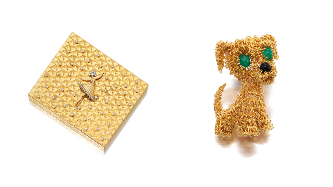 En la categoría de las piezas firmadas en juego se lleva el protagonismo la casa francesa Van Cleef & Arpels. En su sección, hay un compacto de oro y diamantes con el motivo de bailarina característico en la cubierta, rodeado por un motivo de hoja que está grabado y engastado con diamantes. Se estima entre US$30.000 a US$40.000.