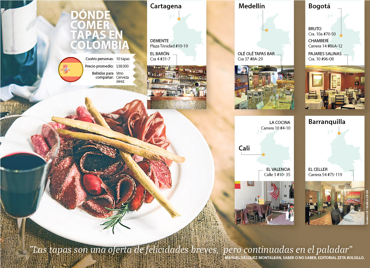 “Tapear es una costumbre que se realiza entre amigos, para comer bien y beber bien”, explican expertos como José Pajares, chef del restaurante Pajares Salinas. En Colombia, donde la oferta gastronómica es cada vez más extensa, se encuentran decenas de lugares en donde se puede ir para un plan de tapeo, como Olé Olé Tapas and Bar Restaurant, en Medellín; o El Barón, en Cartagena.