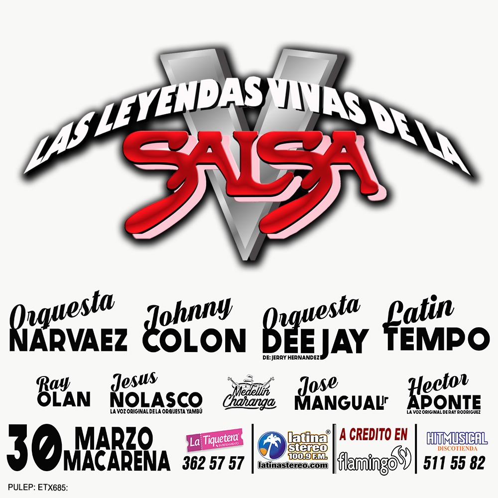 Disfrute de las voces de Johnny Colón, Latin Tempo, Orquesta Dee Jay, Orquesta Narváez, Joe Quijano, Ray Olan, José Mangual y Héctor Aponte este sábado desde las 4:00 p.m. en el Centro de Eventos La Macarena. Este será un espectáculo de salsa de grandes dimensiones, para el que puede comprar boletas desde $80.000.