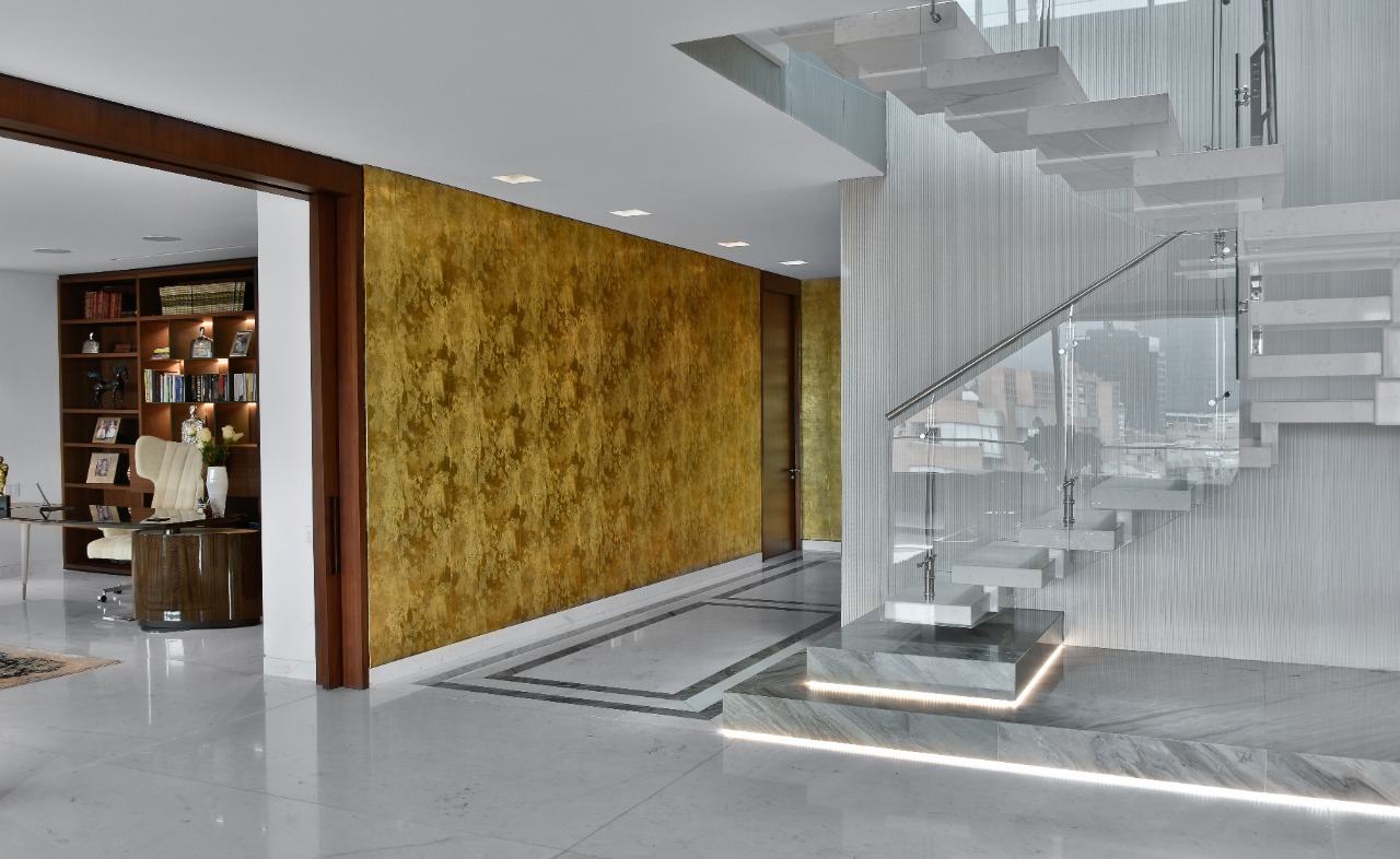 Un elemento que está de moda en el mundo como el gran protagonista de los espacios, ya que viste las paredes que antes eran de color blanco sólido, pero que ahora tienen texturas en gamas de tonos claros. Grandes diseñadores como Valentino, Versace, Cavalli y Armani han sacado sus propios catálogos de estos papeles. En foto: papel de colgadura color oro y papel gris en la pared de la escalera de cristal, espacio con pisos de color blanco y gris.