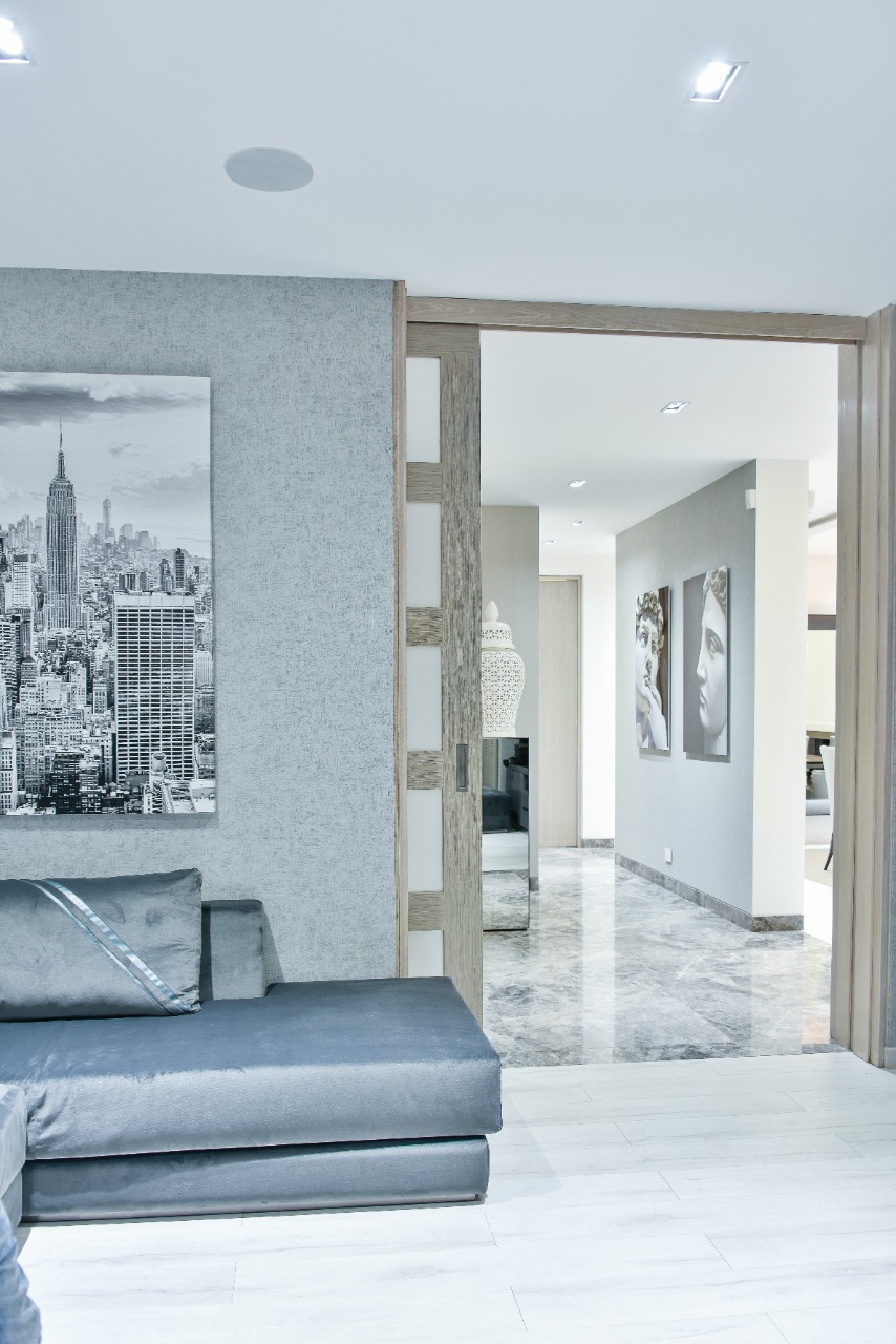 Una tendencia fresca con decoración que usa elementos contemporáneos, los cuales se caracterizan por ser tendencias que perduran con el tiempo y siempre están vigentes. Las lámparas son en acero, los pisos en mármol o con recubrimiento de porcelanato, la carpintería está en tonos claros y en este caso se complementa con el tapete y los sofás de color gris y beige.