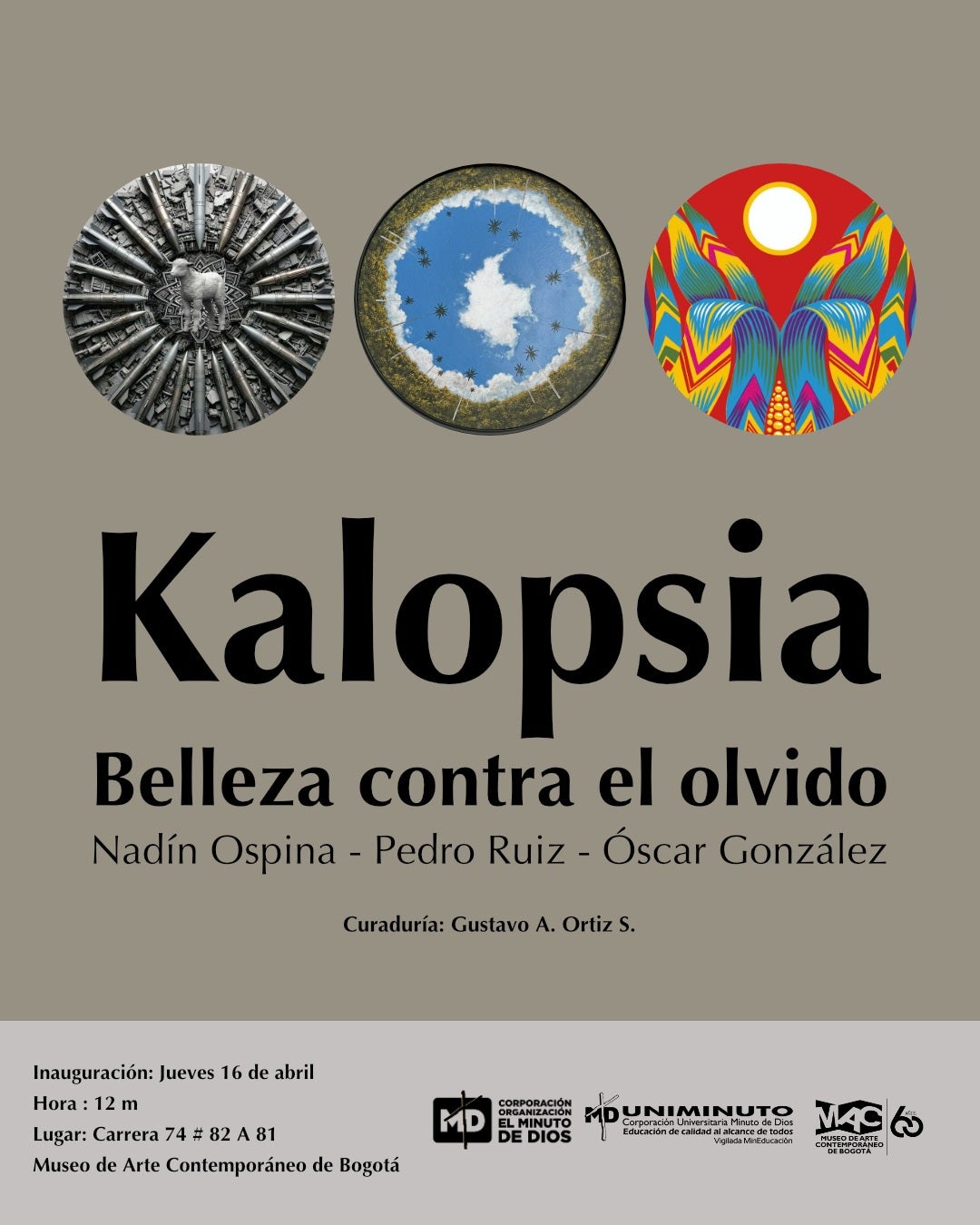 El Museo de Arte Contemporáneo de Bogotá (MAC) presenta la exposición 'Kalopsia, belleza contra el olvido', una muestra que se inaugura en el marco de la celebración de los 60 años de la actividad cultural de El Minuto de Dios, la conmemoración del Día Mundial del Arte y el fin de semana Artbo. La exposición estará abierta al público del 16 de abril al 29 de mayo y se plantea como una apuesta curatorial que invita a replantear la forma en que se narra y se percibe la realidad del país desde el arte contemporáneo.