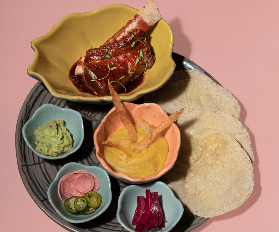 Tiene una costilla de res cocida a baja temperatura, marinada con toques asiáticos y bañada en una salsa BBQ. Vienen acompañados de pico de gallo, guacamole, jalapeños y encurtidos. Tiene un precio de $49.000. Es best seller.