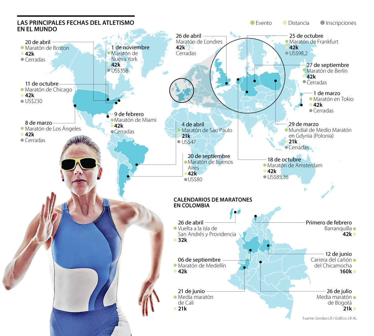 Una de las principales citas es la Media Maratón de Bogotá, que se corre el 26 de julio en la capital este año, y es la única de su tipo con un sello platinum de la World Athletics, distinción que en el mundo solo 12 carreras la tienen: 11 son maratones, de las cuales cinco son asiáticas y se incluye a la Media Maratón de Bogotá. Julio Sandoval, director de Running Colombia, destacó esta carrera como única en el mundo. Seguido de esta maratón, la de las flores de Medellín con 42k es clave a nivel nacional y regional, por ser de tipo clasificatorio para la maratón de Boston.
