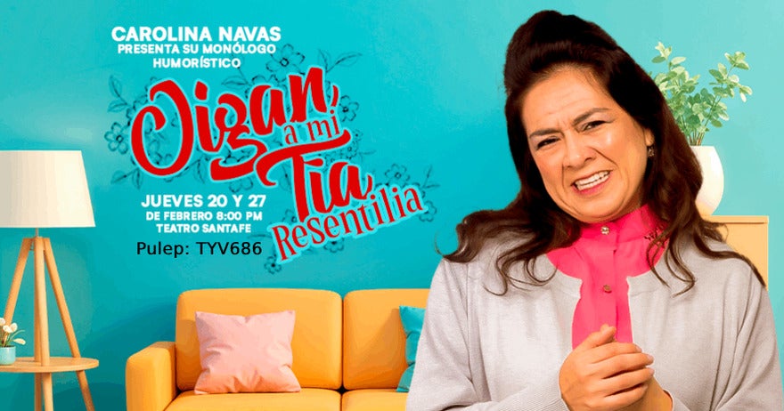 Asista el próximo 6 de marzo al monólogo humorístico presentado por la comediante Carolina Navas, ‘Oigan a mi tía Resintilia’, que se llevará a cabo en el Teatro Santafé. Este stand up aborda las vivencias de una adulta mayor que añora sus tiempos de juventud, a la vez que los compara con los de la actualidad, teniendo al humor y al sarcasmo como eje de su discurso.