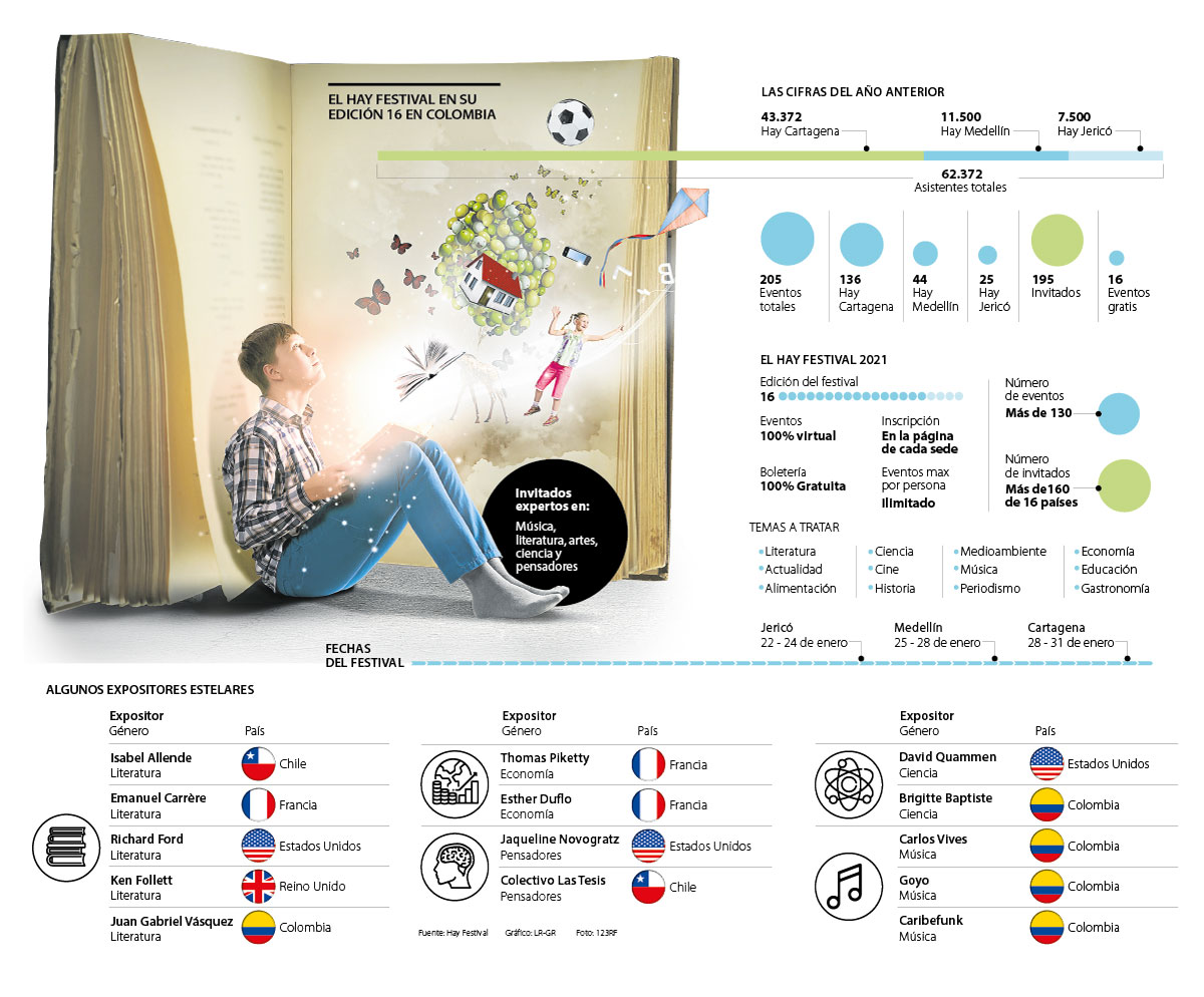 Desde el 22 de enero comenzarán las actividades de la edición número 16 del Hay Festival en Colombia. El primer evento será en el marco del Hay Festival Jericó que va del 22 al 24 de enero con ‘El futuro de la energía’ a las 9:00 a.m., un espacio para hablar sobre fuentes de energía más limpias y eficientes que pueden permitir que los ritmos de la vida se mantengan de manera sostenible y será dirigido por el investigador colombiano Jorge Zuluaga.