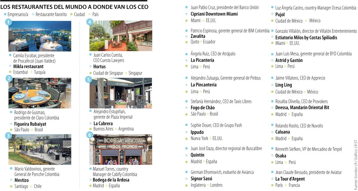Los ejecutivos de empresas como Claro, Juan Valdez, Porsche o Banco Unión se dieron a la tarea de recomendar sus cocinas clave en el extranjero. Madrid, Lima y São Paulo fueron las ciudades que lideraron