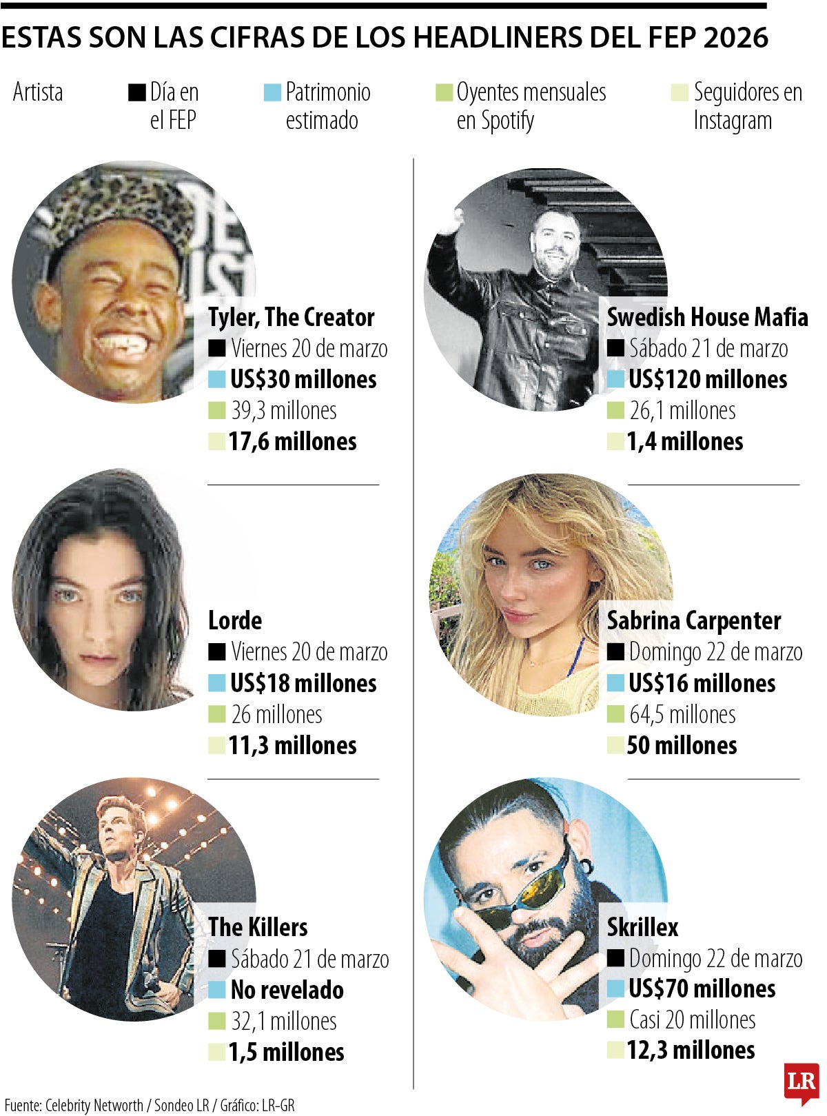 El primer día tendrá a Tyler, The Creator y Lorde, dos artistas que han logrado consolidar carreras de gran alcance y convocar multitudes en todo el mundo. Tyler, rapero y productor estadounidense, ganó US$53 millones antes de impuestos y comisiones en 2025 solo por su música, según estimaciones de Forbes, lo que lo ubicó en el puesto 13 entre los músicos mejor pagados del año. Además, reúne cerca de 39,3 millones de oyentes mensuales en Spotify, una muestra de su peso actual dentro de la industria. Por su parte, Lorde se consolidó como una de las artistas más importantes de la década de 2010 tras lanzar ‘Royals’ a los 16 años, tema con el que ganó dos premios Grammy. En plataformas digitales mantiene una presencia sólida, con 26 millones de oyentes mensuales en Spotify y alrededor de 11 millones de seguidores en Instagram, cifras que reflejan la vigencia de su propuesta dentro del pop contemporáneo.