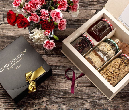 La tienda en Bogotá tiene tres opciones de kits para todo tipo de madres. La opción más grande incluye una mezcla para porridge, granola, chocolate orgánico, infusión de frutos rojos y miel orgánica, además de una torta de Chocology y 36 claveles de Flores Colón.