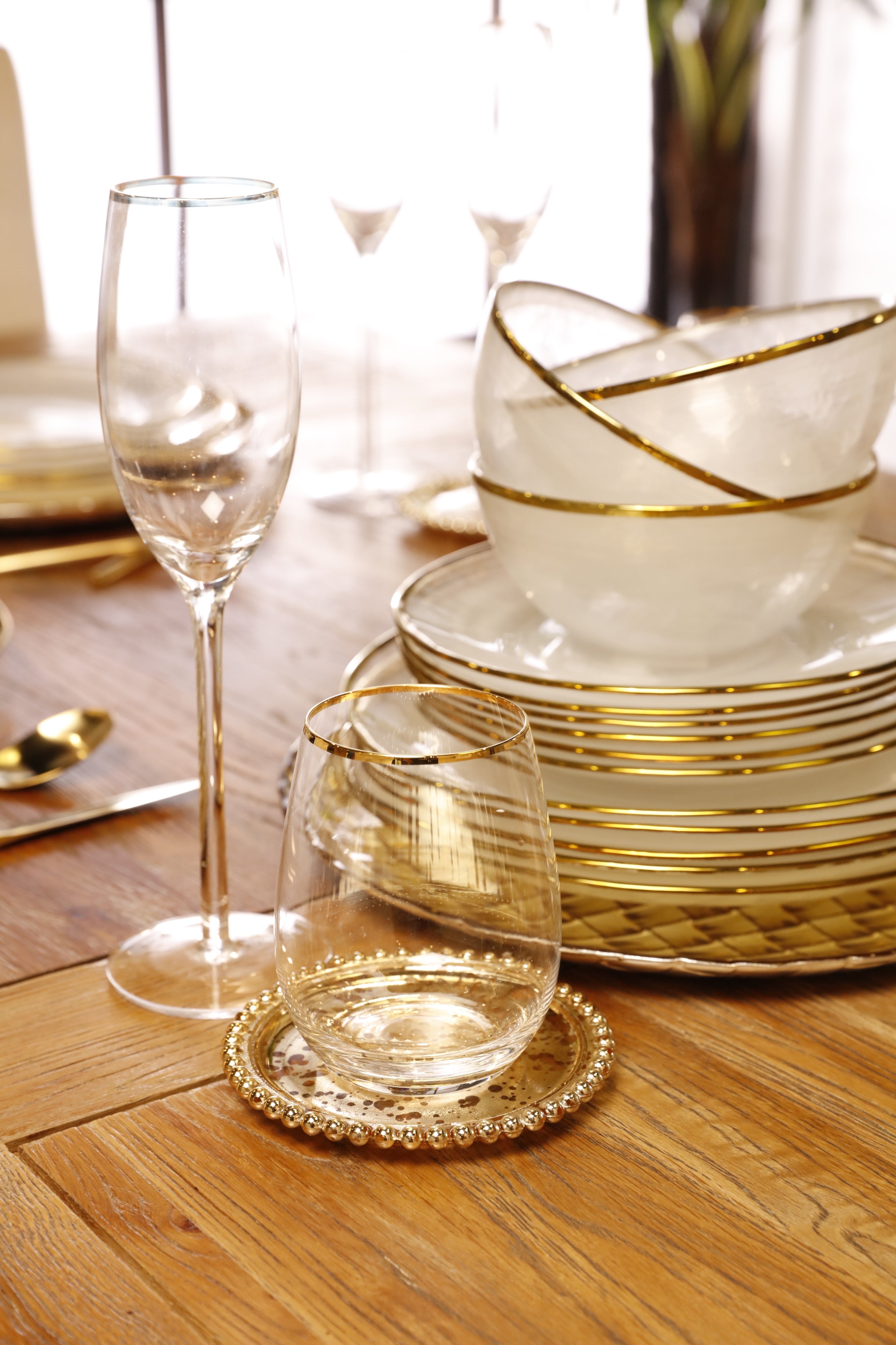 Los toques en tonos dorados que bordean las vajillas y las copas, junto con las transparencias ofrecen elegancia al menaje.