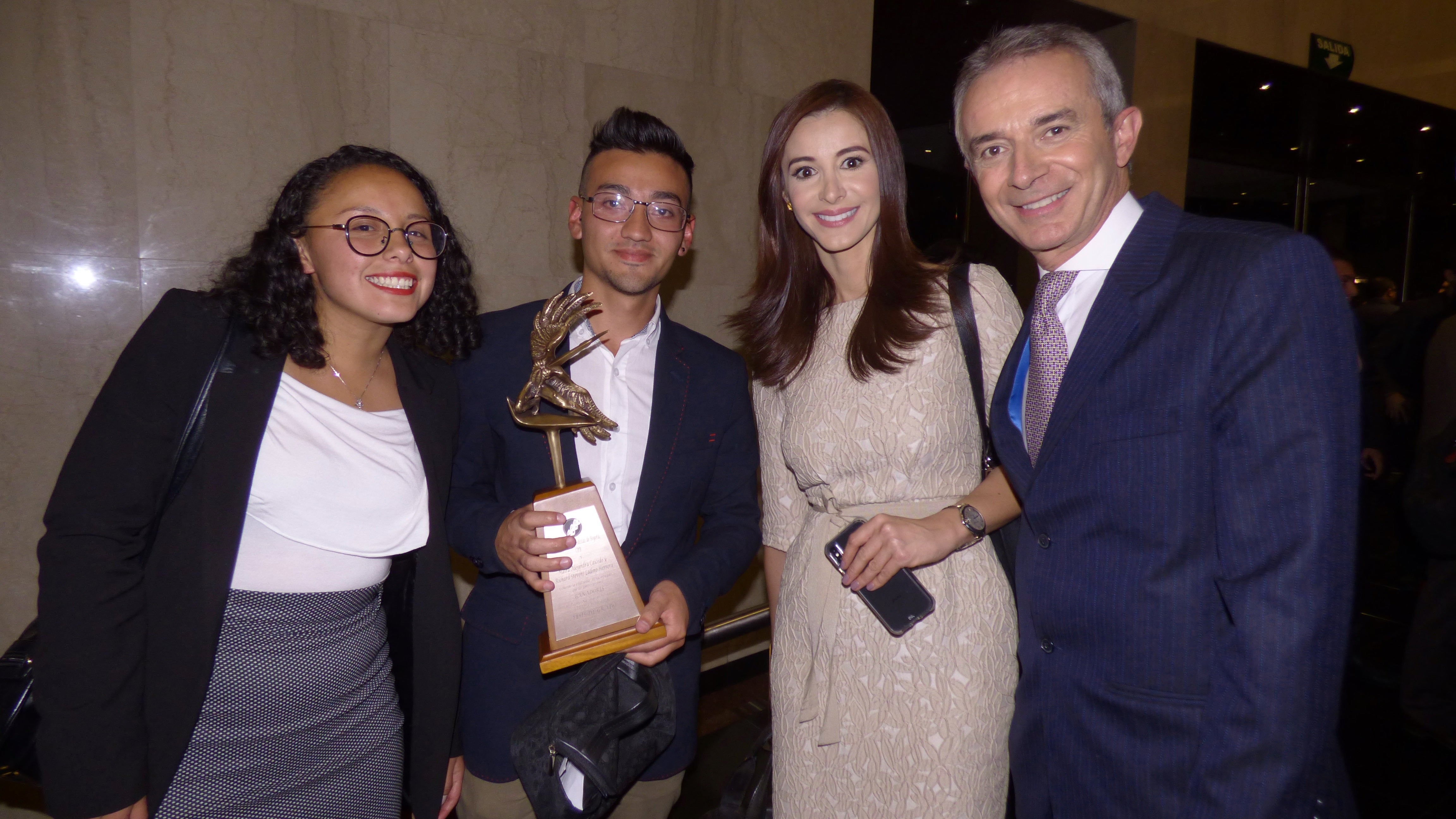 Los estudiantes de Uniminuto, Maira Caicedo y Richard Ladino, acompañados de los periodistas y presentadores Alejandra Giraldo y Juan Eduardo Jaramillo.