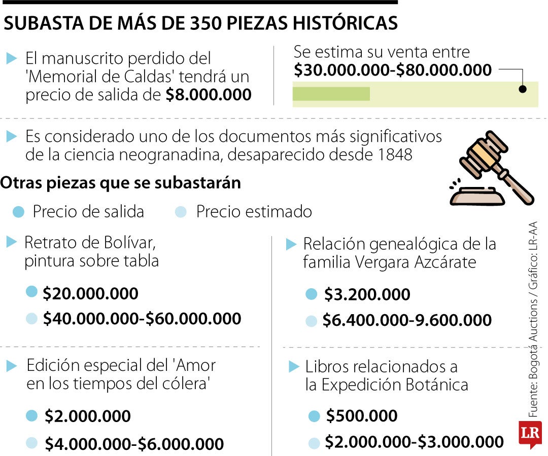 La subasta de hoy, a las 7:00 p.m., se realizará en dos sesiones: una presencial con participación virtual y otra exclusivamente en línea. Junto al ‘Memorial de Caldas’, se presentarán más de 350 piezas de gran valor histórico, incluyendo varias vinculadas con la Expedición Botánica, una rarísima traducción bogotana de la Constitución de los Estados Unidos (1812), dos álbumes fotográficos colombianos del siglo XIX y un original del acta de Independencia de Cundinamarca de 1813. El catálogo reúne primeras ediciones, libros de historia colonial y moderna; manuscritos; mapas; grabados y piezas de coleccionismo sobre Colombia, Hispanoamérica, Cartagena de Indias y Simón Bolívar.