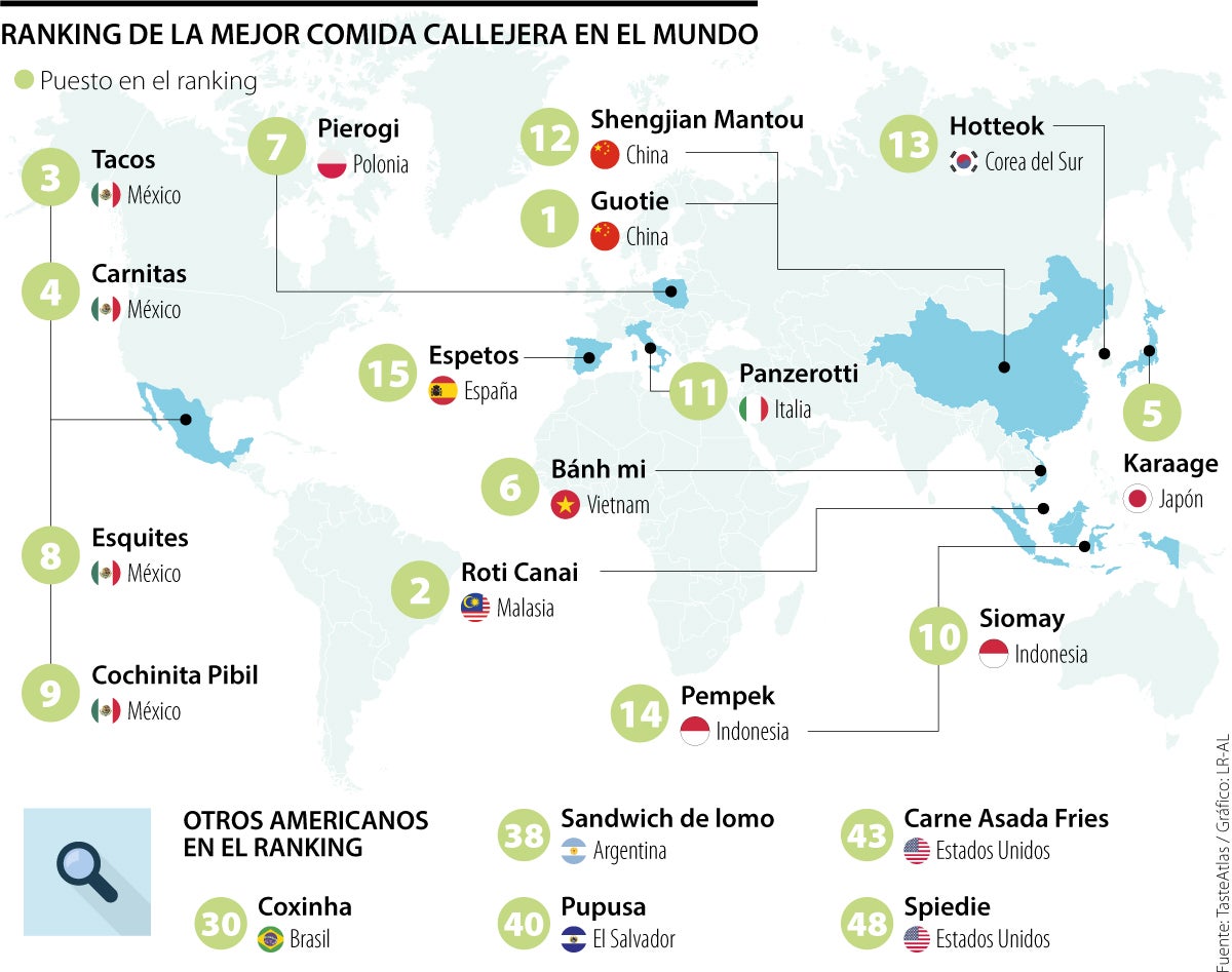 Los tacos fueron los grandes protagonistas de este listado. Solo detrás del guotie de China y del toti canai de Malasia, los tacos en general ocupan el tercer puesto del listado con una puntuación de 4,7 estrellas. “Hoy en día, la palabra es ampliamente conocida por significar, mundialmente, un sinónimo de comida callejera y rápida”, escribió la publicación.