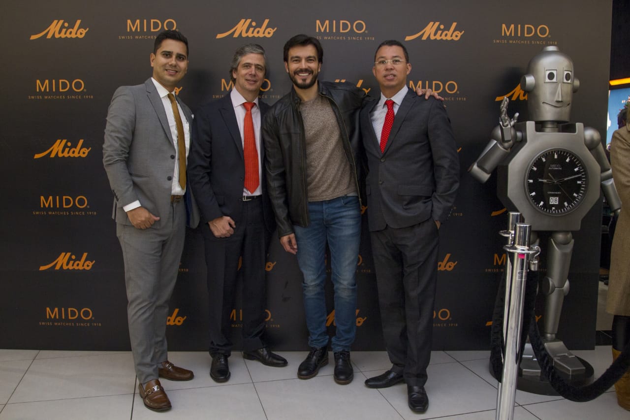 Edgardo Blanco, brand manager Mido Colombia; Samuel Glauser, gerente general Disuiza; Luciano de Alessandro, actor; y Roberto Rodríguez, brand manager regional de Mido.