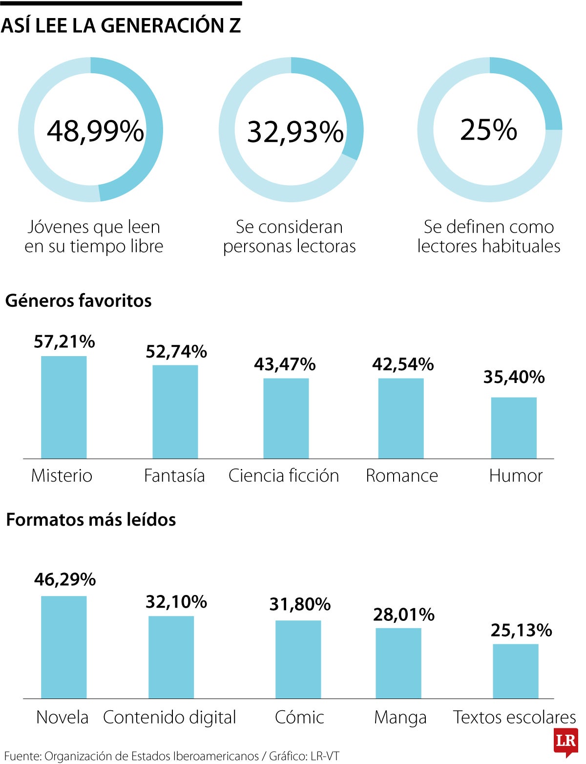 Los jóvenes hoy leen en diversos formatos y géneros, y usan las redes sociales como espacios de divulgación para encontrar, recomendar y disfrutar del hábito de la lectura. De acuerdo con el estudio ‘Prácticas y percepciones de lectura en adolescentes y jóvenes’, elaborado por la Organización de Estados Iberoamericanos, OEI, 48,99% de los jóvenes afirma que la lectura sigue siendo una de sus prácticas de ocio y que la realiza de forma frecuente durante su tiempo libre.