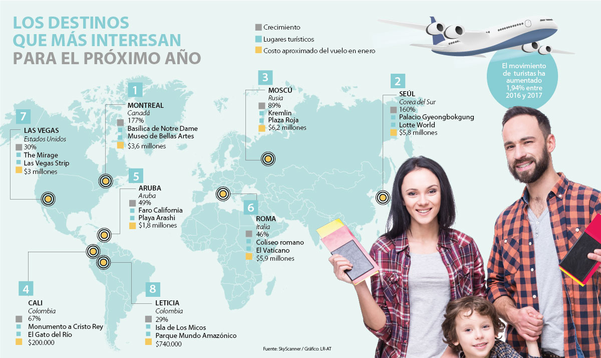 No han pasado aún las vacaciones de Navidad y fin de año y ya hay colombianos pensando o preparando sus viajes de 2018. Así lo refleja un estudio del portal SkyScanner, que ya identificó cuáles son los destinos tendencia para el próximo año, según el incremento del nivel de preferencia.