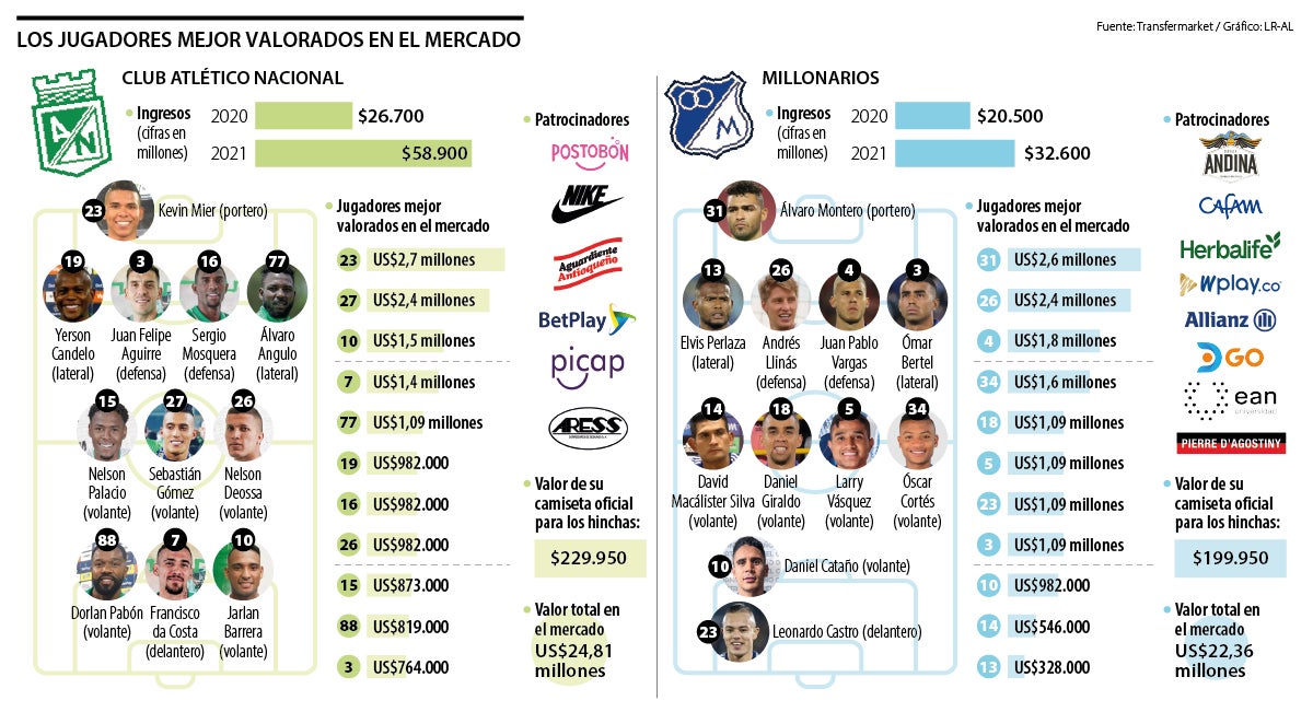 Pero la rivalidad va más allá del terreno futbolístico, pues esta también será una final empresarial. Mientras Nacional facturó en 2021 $58.900 millones,Millonarios registró ingresos de $32.600 millones. En valor de los equipos, los verdes también llevan la delantera, con una cifra de US$24,81 millones, mientras que los azules ascienden a US$22,36 millones.
