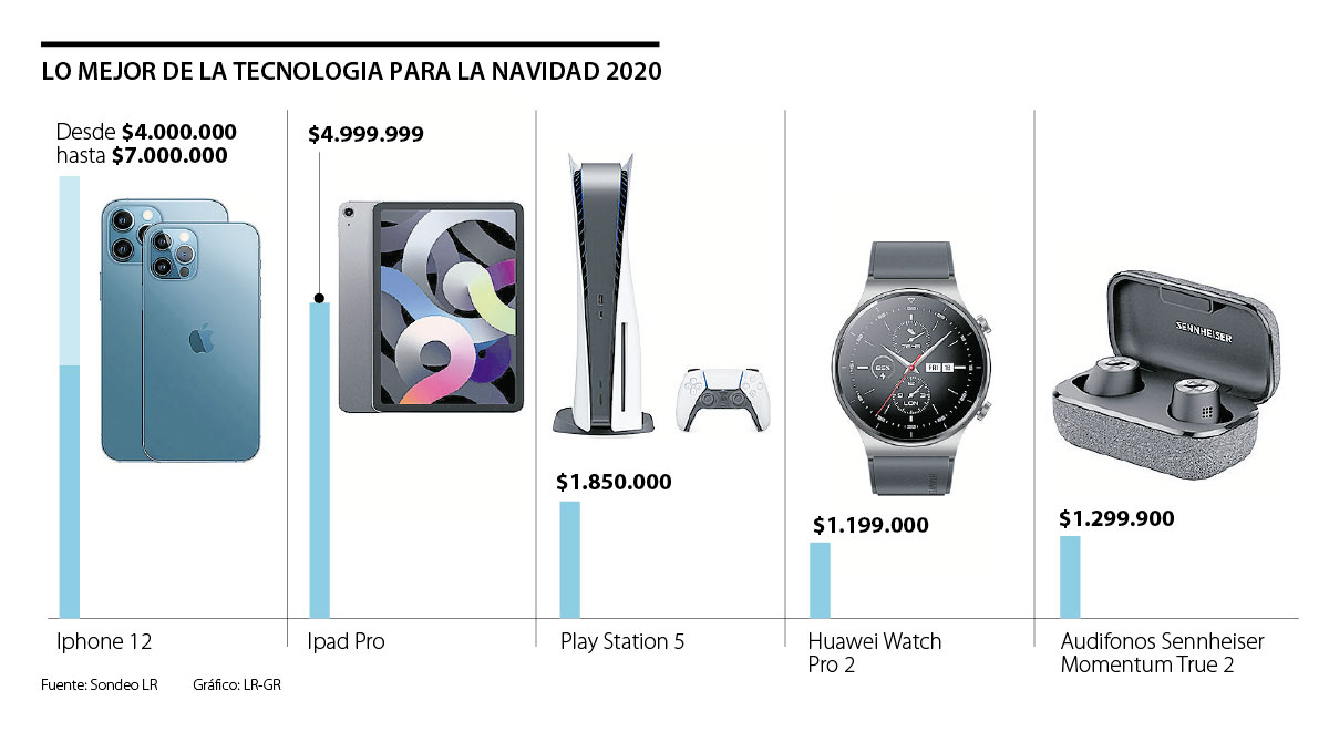 Respecto a esta última categoría, el rey del mercado navideño de lujo es el iPhone 12, que llegó al mercado local a inicios de noviembre. El dispositivo se puede adquirir en diferentes presentaciones y con valores que van desde $4 millones, hasta $7 millones. Este ofrece una gran experiencia en máquina que combina el diseño y cámaras profesionales.
