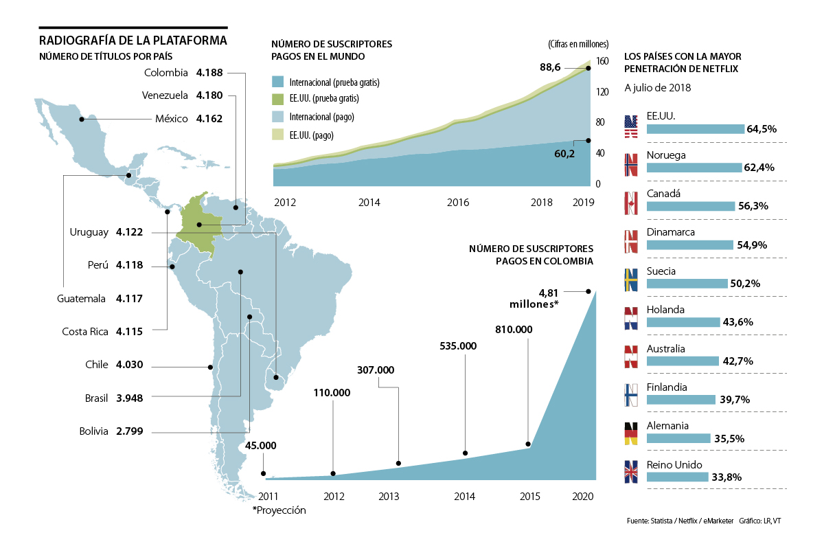 Eso explica el porqué de que Colombia sea el mercado latinoamericano con mayor número de títulos, con 4.188, y con un número de suscriptores pagos que para 2020 se espera que sobrepasen los 4,8 millones de personas.