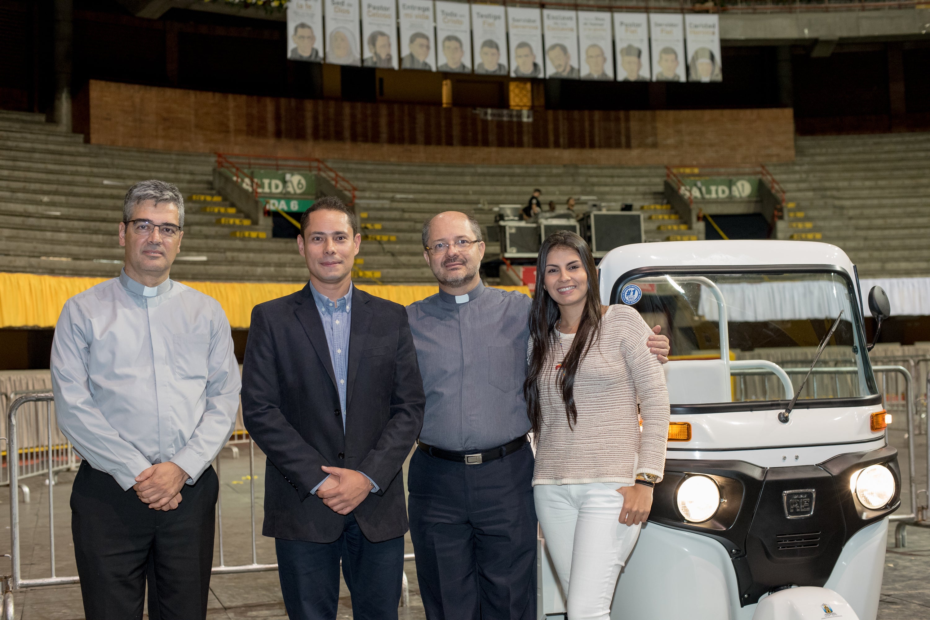 Padre Gabriel Molina; José A. Rojas, dir. de Asuntos Corp. Auteco; Padre Leonardo Martínez, y Manuela García, prod. gral. Visita del Papa a Medellín