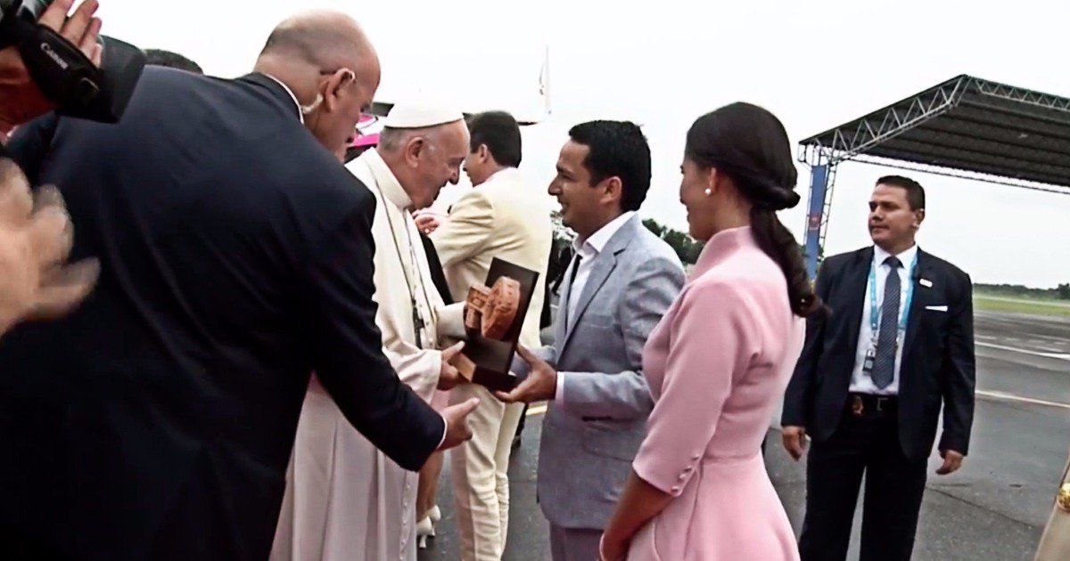 El alcalde de Villavicencio, Wilmar Barbosa, recibe al Papa con un regalo a su llegada a la capital del Meta