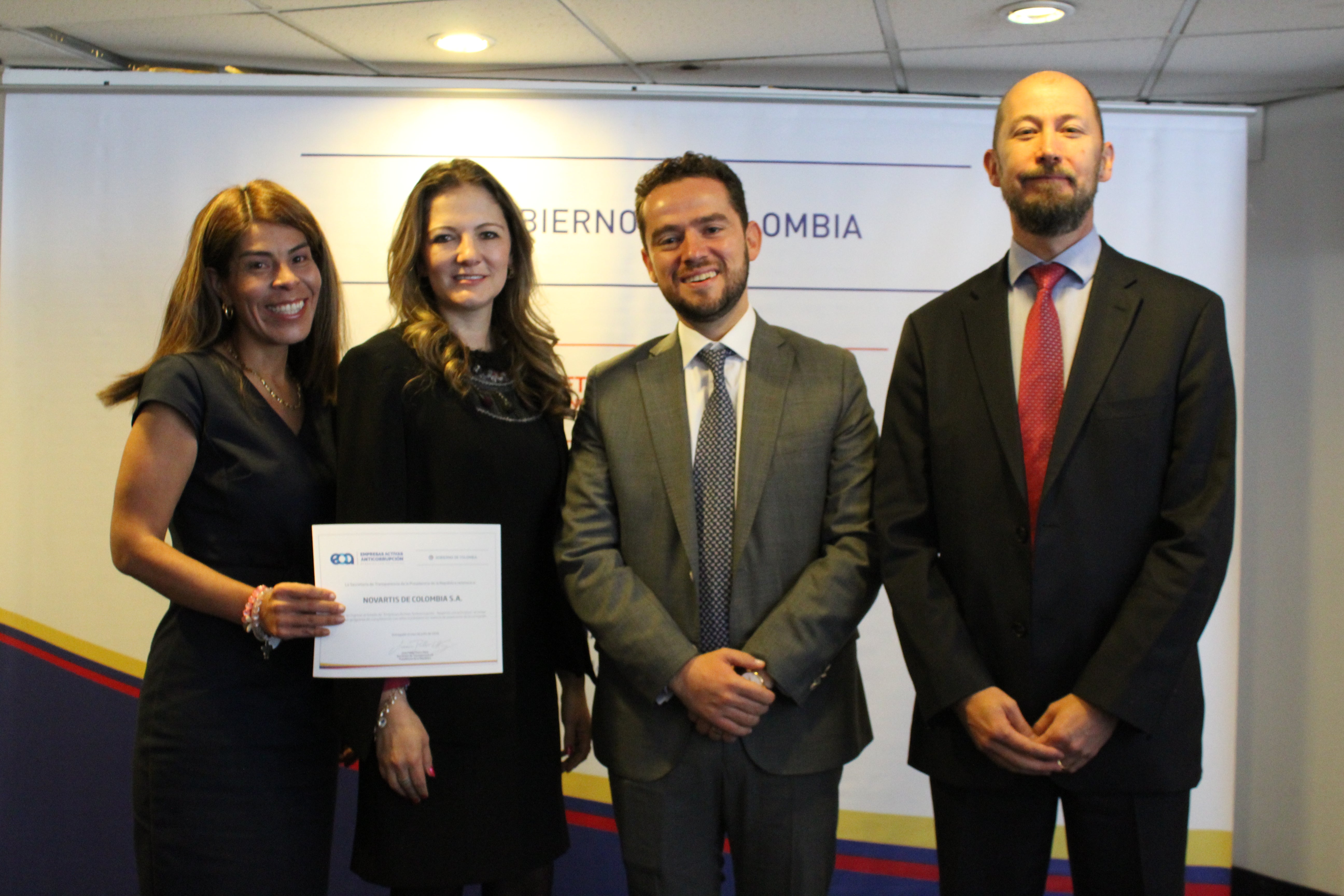 María Elvira Olmos, Head de Compliance Novartis; Sandra Marcela Rodríguez, gte. Comunicaciones Novartis Oncología; Juan Pablo Charry, sec. Transparencia Gob. Santos, y Carlos Rodríguez, dir. Franquicia Inmunología Novartis Región Andina.