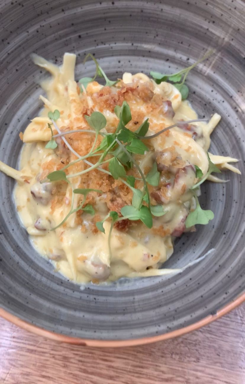 El primer plato con el que el restaurante se lanzará al festival es una carbonara de palmitos del Putumayo, perfecto para quienes disfrutan la comida de mar. En lugar de usar pasta el plato tiene tiras de palmitos, acompañados de salsa tradicional y guanciale.