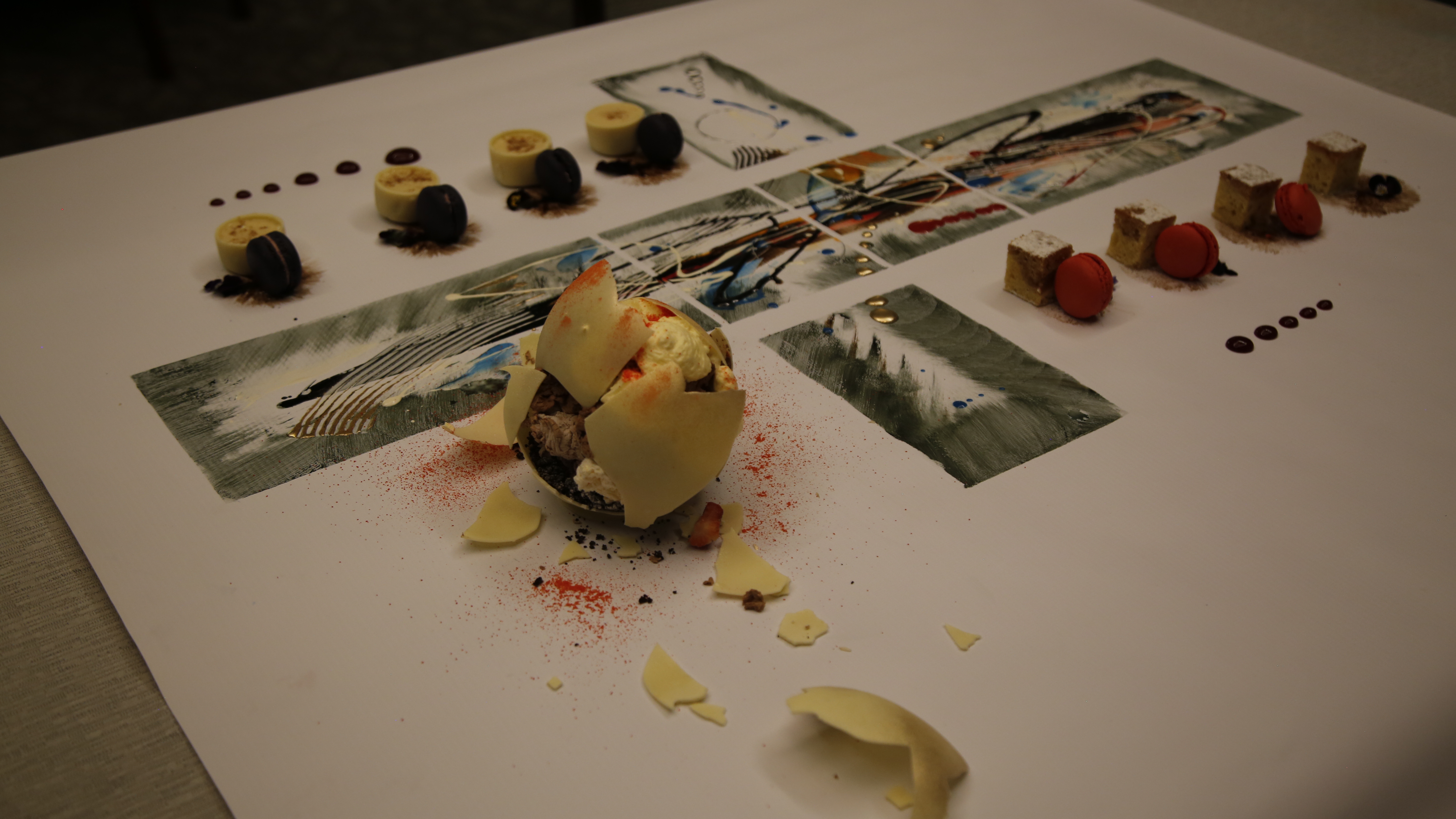 Pintura de salsas de chocolate sobre lienzo que van armando dos chefs sobre la mesa ante los comensales, trae mousse, nitro helado del día, frutas, chocolate, crocantes y toppings.