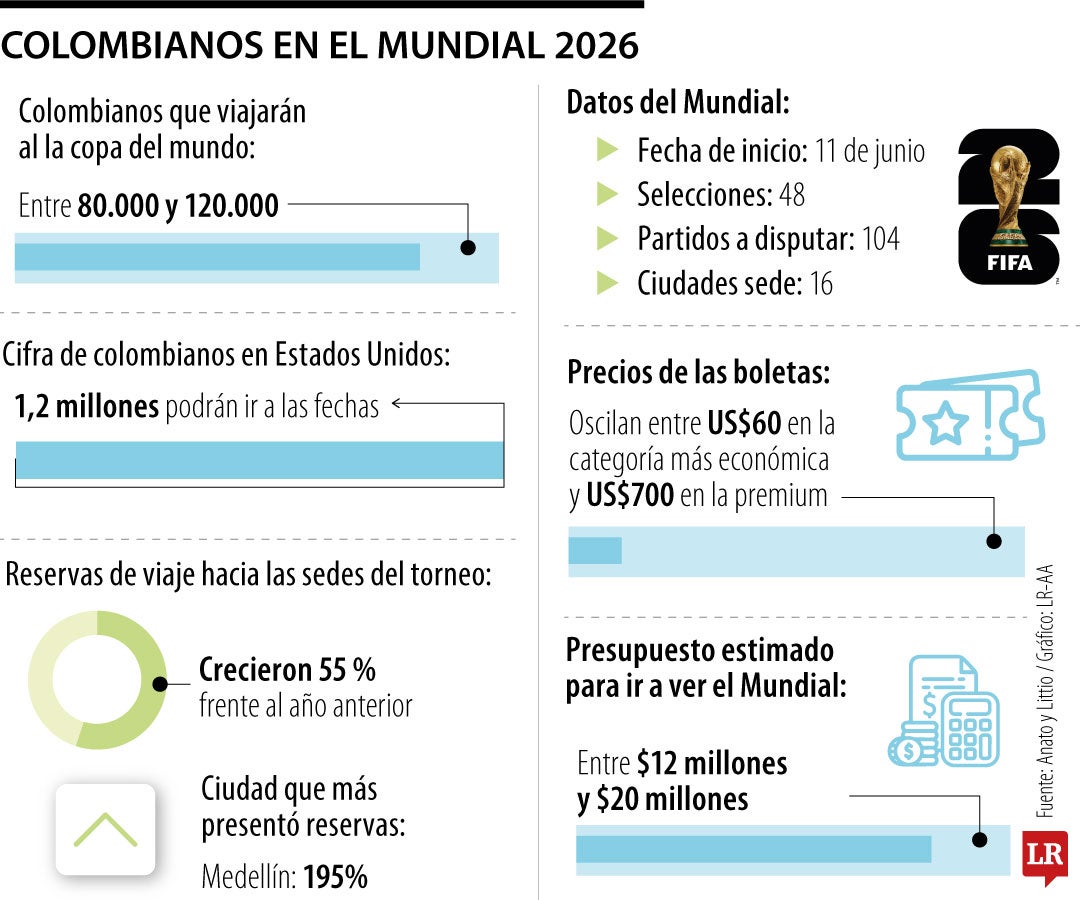 Se estima que entre 80.000 y 120.000 colombianos, de acuerdo con un balance de Littio, viajarían a las sedes del Mundial Fifa 2026 en México, Estados Unidos y Canadá, según con proyecciones basadas en datos de Migración Colombia, Anato, plataformas de viaje y el antecedente de los más de 36.000 connacionales que asistieron a Rusia 2018.