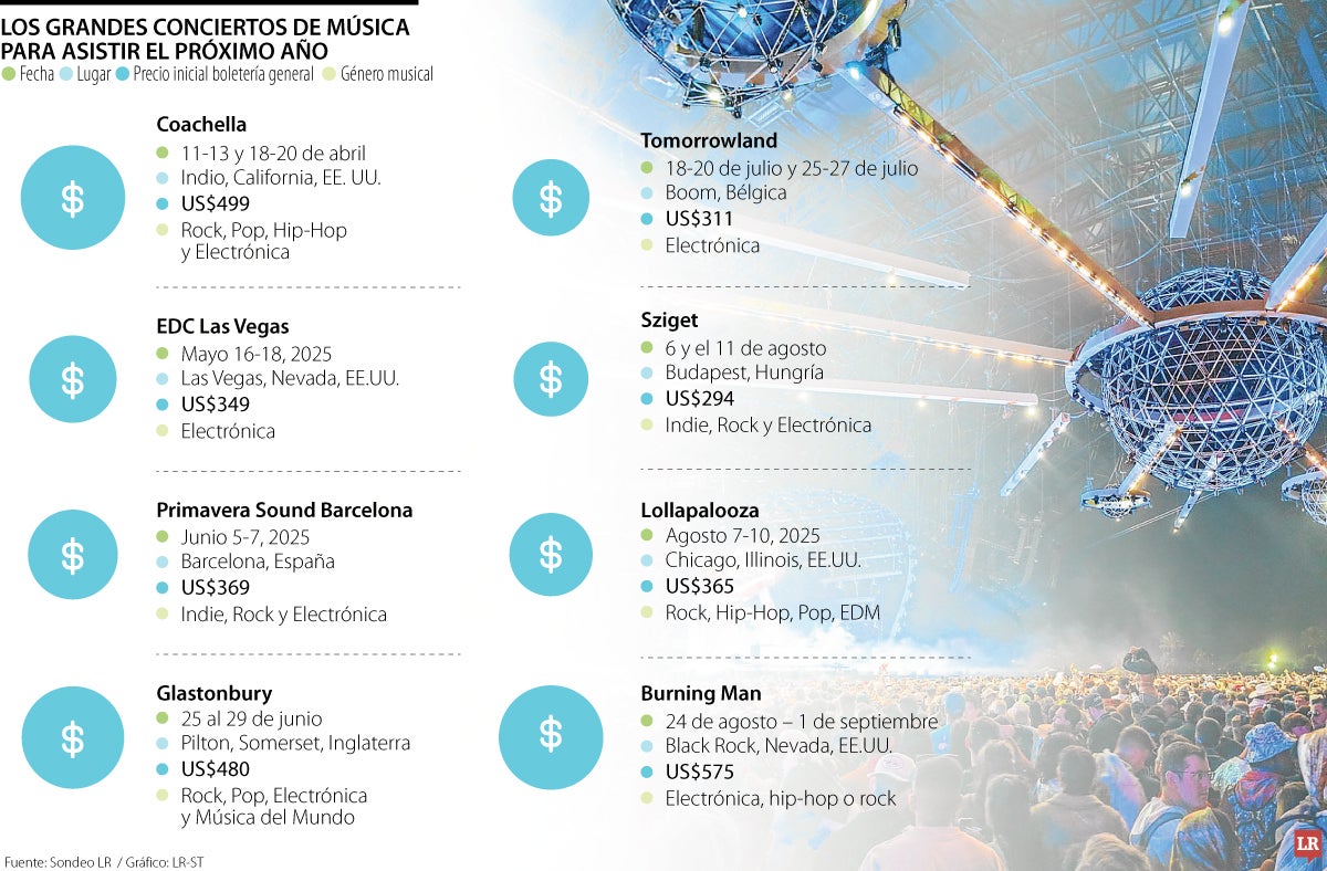 Los otros son: Sziget, en Hungría, del 6 al 11 de agosto (boleta general desde US$294); el Lollapalooza, del 7 al 10 de agosto (US$365); y el Burning Man. “Son festivales a los que hay que asistir por lo menos una vez en la vida”, expresó el empresario Julio Correal.