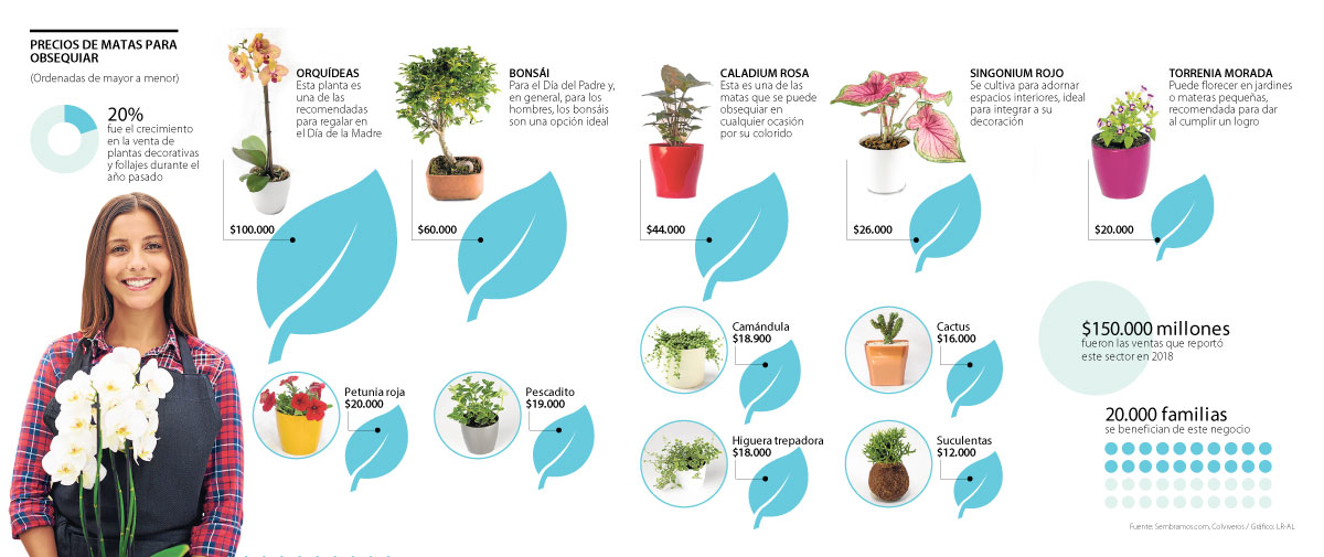 De acuerdo con las expertas, las plantas también proporcionan una facilidad a la hora de buscar un obsequio, pues pueden darse a hombres y mujeres por igual. Además, las hay de todos los precios, por lo que pueden servir para cualquier presupuesto. Según Salinas, el costo promedio de una mata para obsequiar, como las afamadas suculentas, es de $12.000. Incluso, si se adquiere una matera con un diseño especial, sigue siendo un regalo muy accesible. En promedio una de estas plantas en una maceta de este tipo puede costar en promedio $41.000. Los precios pueden ir hasta $150.000 cuando se adquieren orquídeas.