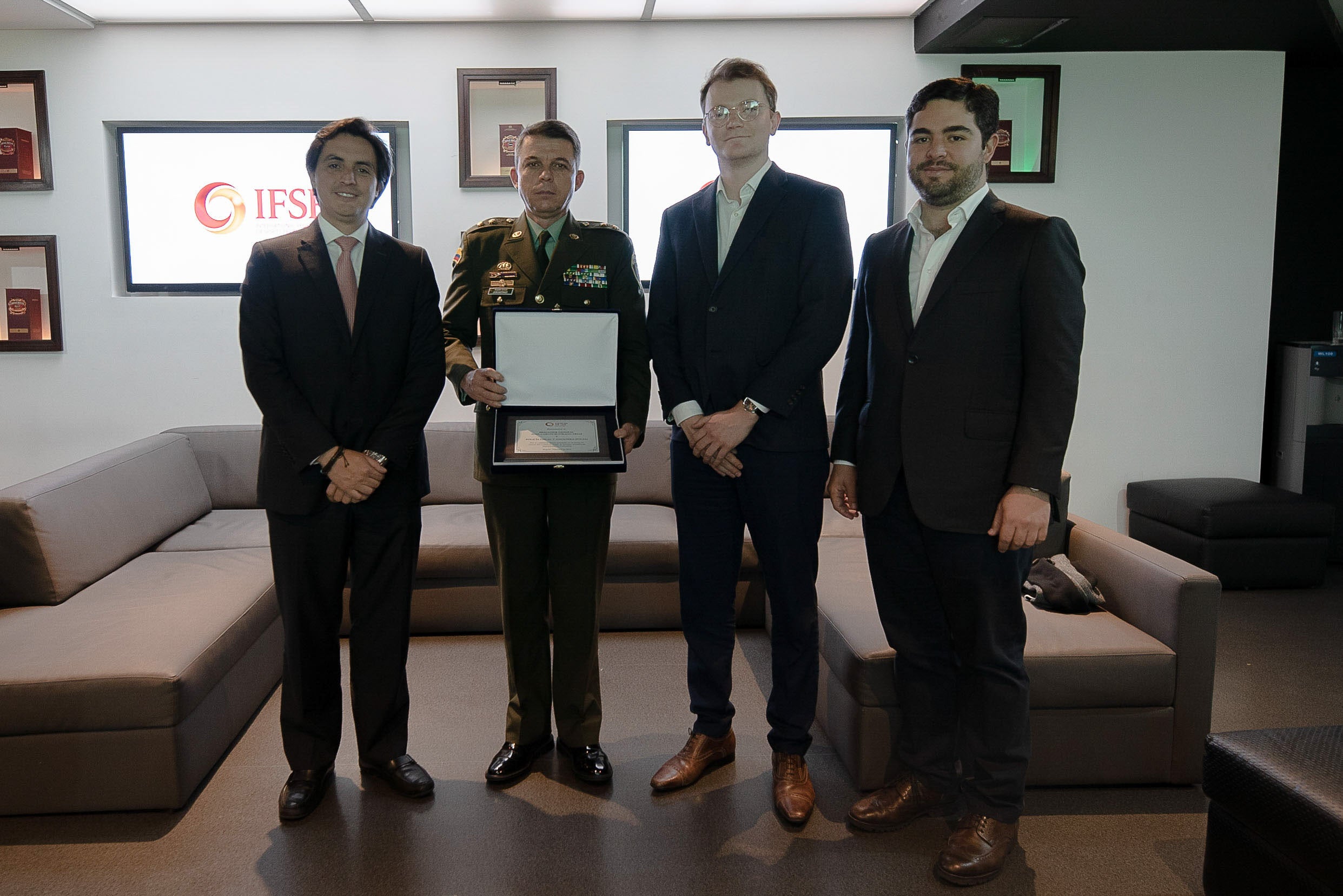 Pablo Enrique Urrego, director Legal de Diageo Colombia S.A.; Brigadier General Juan Carlos Buitrago Arias, director de la Policía Fiscal y Aduanera; Brian Collin, delegado del Director General de la Federación Internacional de Productores de Licores; y Juan Antonio Moreno, director Legal y de Asuntos Públicos de Pernod Ricard Colombia S.A.
