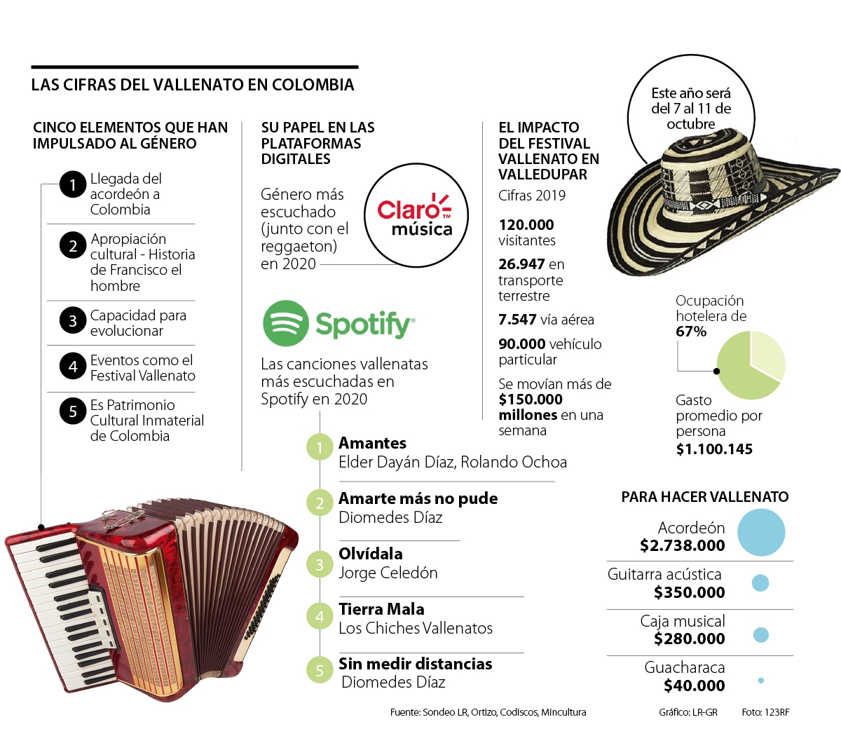Para cerrar, es importante destacar el evento más significativo del género: el Festival de la Leyenda Vallenata que, además de contribuir a la conservación del ritmo, desde 1968 deja millonarias cifras a la economía nacional. Según estima la Cámara de Comercio de Valledupar, en 2019 más de 120.000 visitantes llegaron a la ciudad para asistir al evento, lo que dejó la ocupación hotelera al 67% y representó un gasto por persona de más o menos $1 millón.