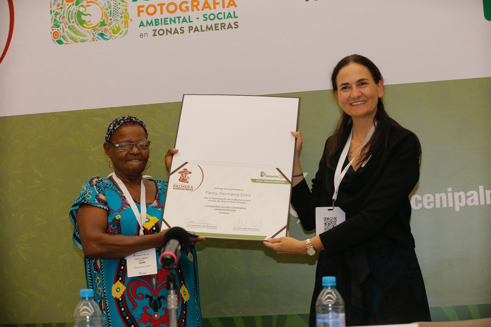 Fanny Germania Ortiz, ganadora en la categoría de mujer palmera campesina; Catalina Restrepo Rada, presidente de la Junta Directiva de Fedepalma.
