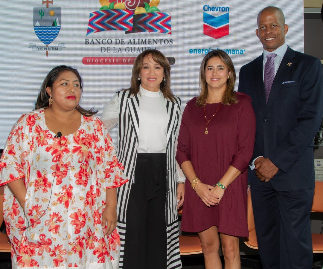 Mónica Barros, líder comunitaria wayuú y artesana; Patricia Serrano,gerente de asuntos corporativos para Chevron Latinoamérica; María Juliana Ruiz, primera dama de la Nación; y Marc Payne, presidente de Chevron Colombia.