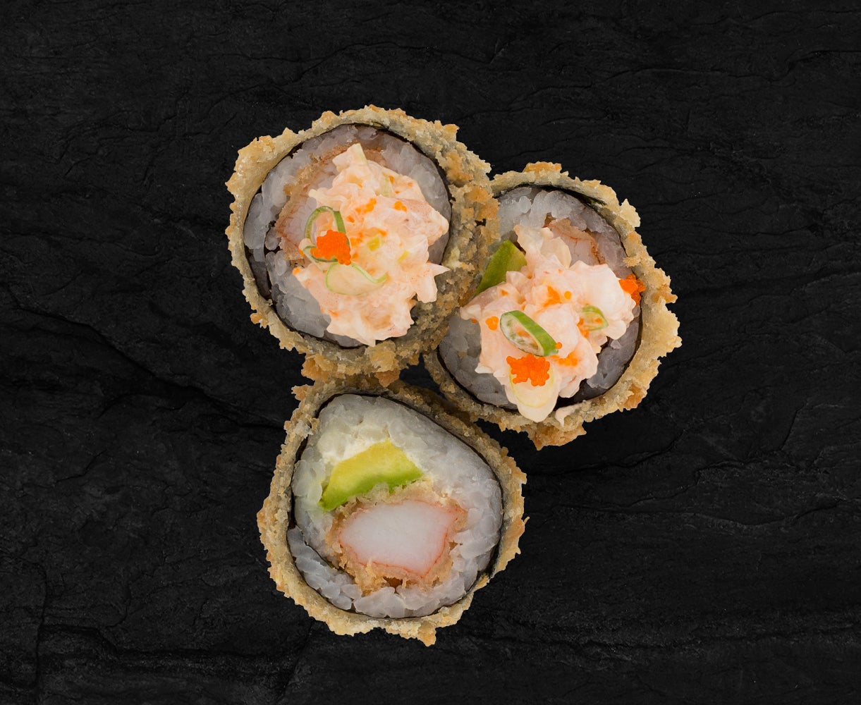 Cuentan con dos opciones de sushi. Uno es un bocado de langostino crispy, aguacate, pescado blanco, mayonesa acevichada y furikake. Y otro de kanikama tempura, queso crema, aguacate y tope de gratinado de camarón.