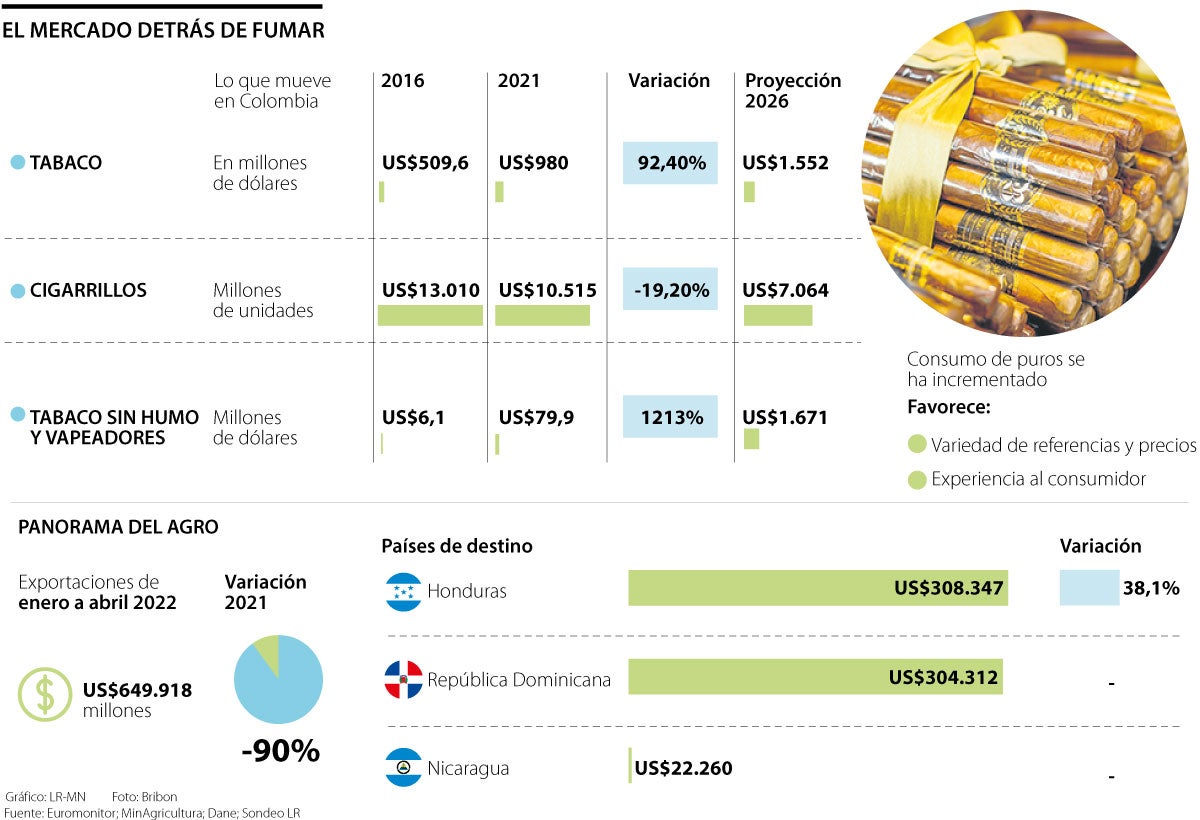Las cifras confirman este buen momento, no solo para los puros, sino para el tabaco en general, pues Euromonitor Internacional registra que en el último año este mercado movió en Colombia más de US$980,4 millones. Y la variación en el último quinquenio es de 92,4%.