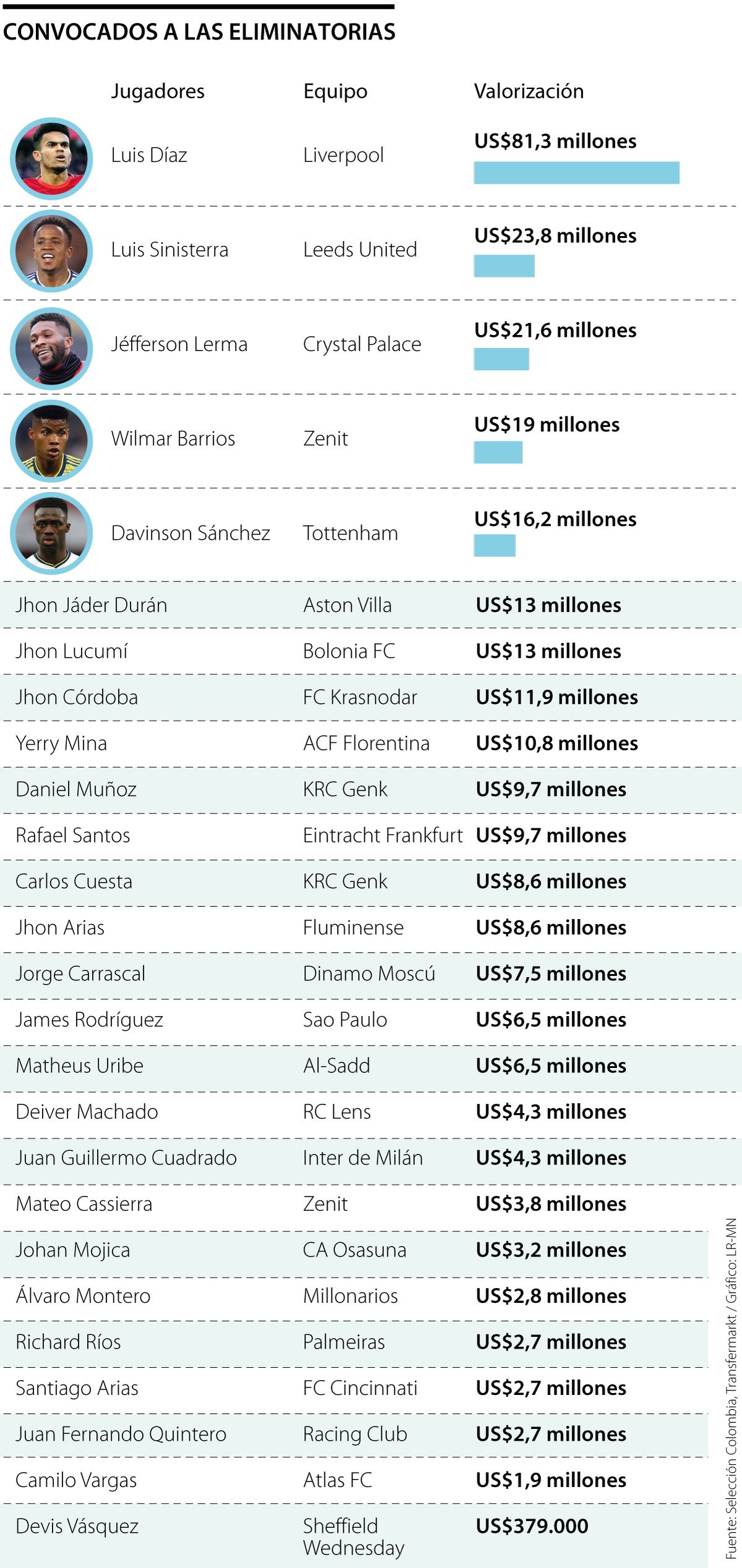 La Selección Colombia publicó a los convocados por Néstor Lorenzo para las fechas 1 y 2 de las Clasificatorias a la Copa Mundial de la Fifa 2026 que inician la próxima semana. En total son 26 jugadores que, actualmente, pertenecen a clubes en todo el mundo. LR realizó un sondeo de cuáles son los mejor valorados en el mercado.