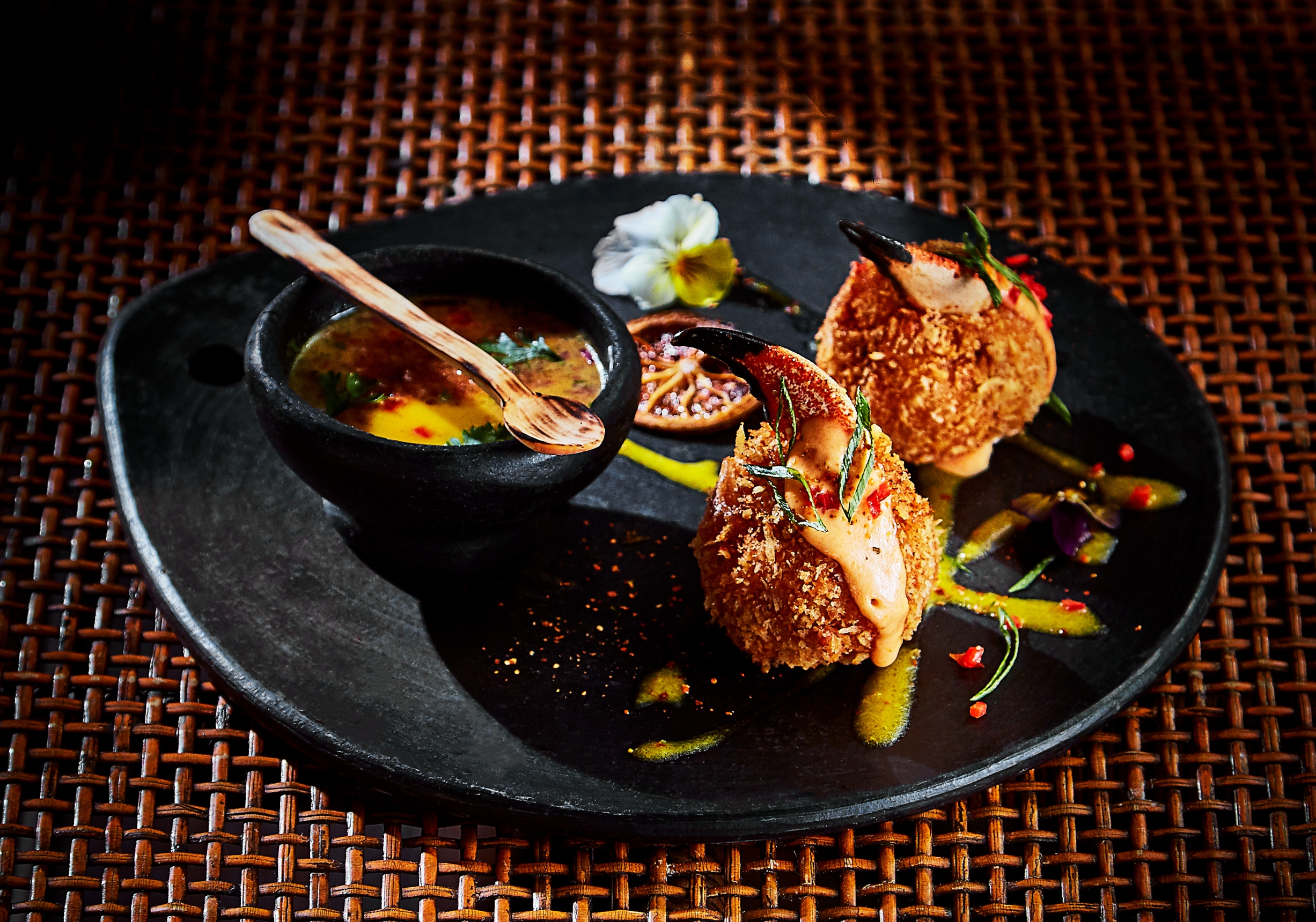 Estas son unas deliciosas croquetas de tartar de cangrejo con langostino. Están rellenas de queso derretido y vienen acompañados de una salsa chalaca. El plato perfecto para acompañar un coctel.