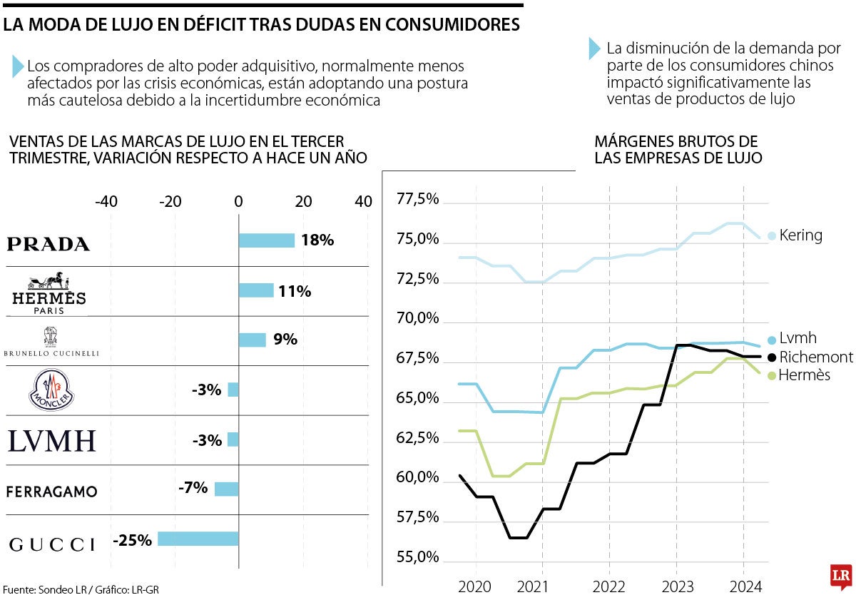 Para la muestra están las cifras. Las ventas del gigante de moda y cuero Lvmh cayeron por primera vez desde la pandemia, ya que se vio afectado por una caída en la demanda de los consumidores chinos. En general, cayeron 3%. Los ingresos orgánicos de la unidad clave, cuyas marcas incluyen Louis Vuitton y Christian Dior, disminuyeron 5% en el tercer trimestre, dijo Lvmh Moët Henness y Louis Vuitton en un comunicado. Por otro lado, sus rivales estadounidenses, incluidos Ralph Lauren y Estée Lauder, han caído en las operaciones de Nueva York, mientras que los ADRs del propietario de Gucci, Kering, también han registrado caídas.