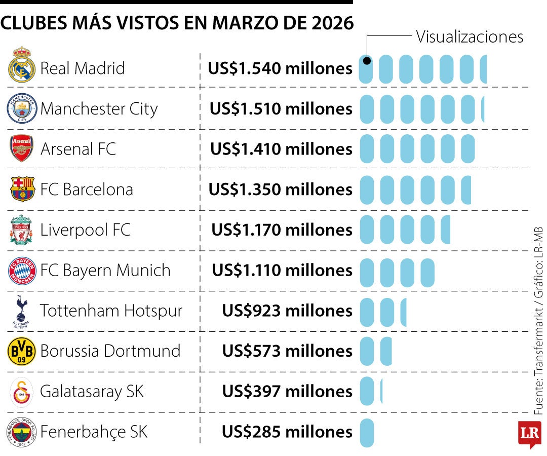 Los fans de los clubes de fútbol más importantes del mundo ya no solo cuentan en los partidos, sino también en el terreno digital. Por eso, Transfermarkt publicó un ranking de los equipos más vistos en marzo de 2026, liderado por el Real Madrid con US$1.540 millones