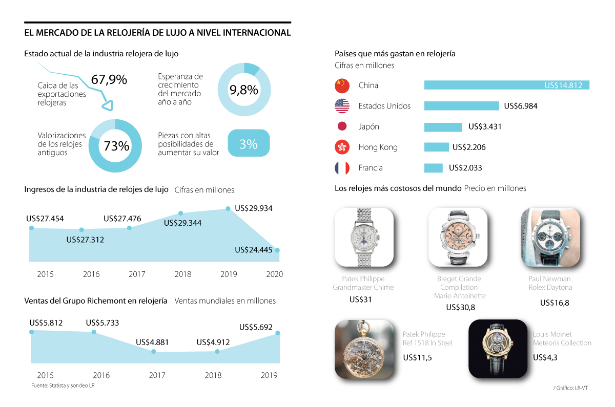 Si bien solo el 3% de los relojes de lujo tienen una alta probabilidad de aumentar su precio en el mercado una vez hayan salido de las tiendas, ese porcentaje tiene la posibilidad de crecer 73% su precio, una cifra que les resulta atractiva a muchos compradores internacionales que han incluso llegado a invertir US$31 millones en una sola pieza, como es el caso del Patek Philippe Grandmaster Chime de la casa Patek Philippe, que se vendió el año pasado en la subasta benéfica Only Watch.